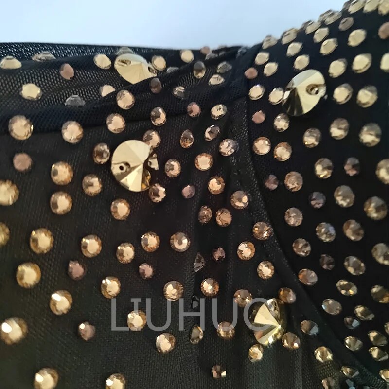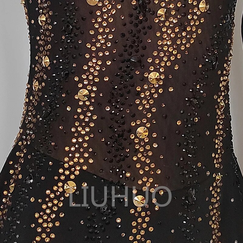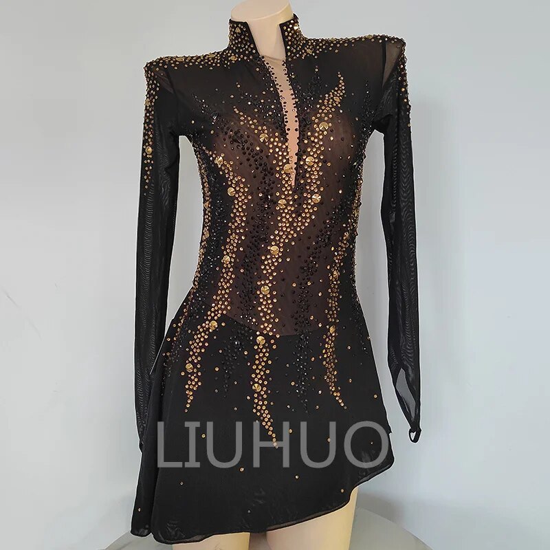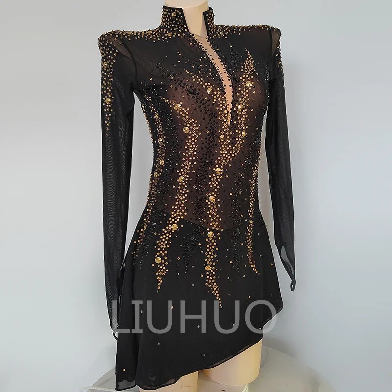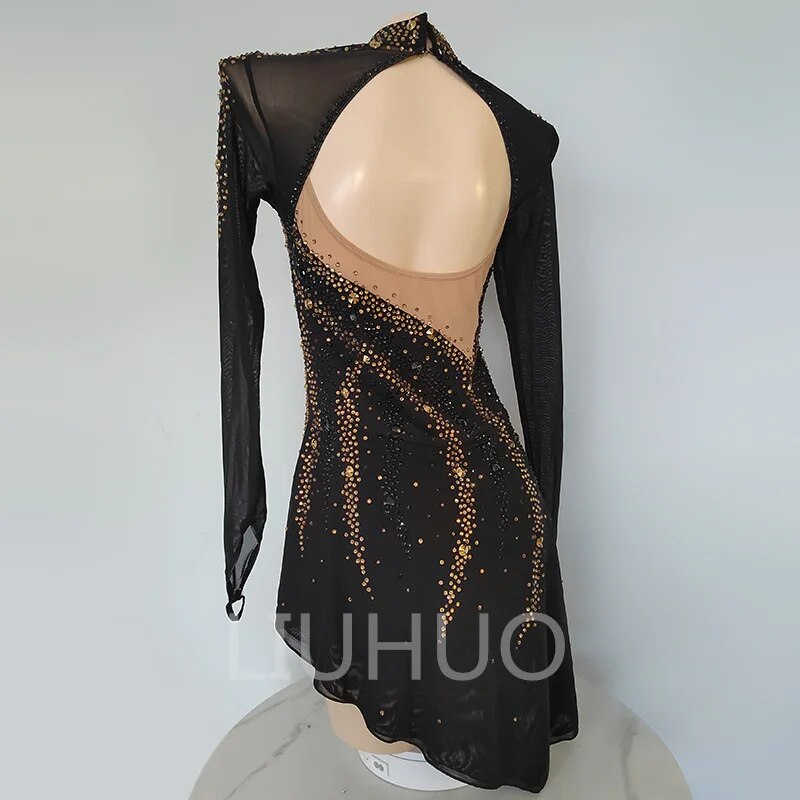 ❤ Features:This long - sleeved figure - skating dress presents an elegant and glamorous style. The base color is black, with sheer mesh fabric on the upper body, densely adorned with gold and black rhinestones, creating a striking pattern. The high - collar design and the embellishments on the shoulders enhance its sophistication. The short skirt complements the overall look, making it suitable for figure - skating performances, combining both aesthetic appeal and functionality.