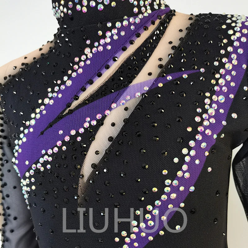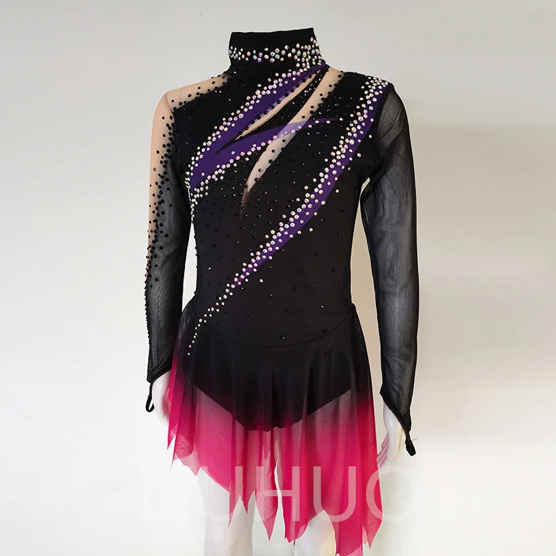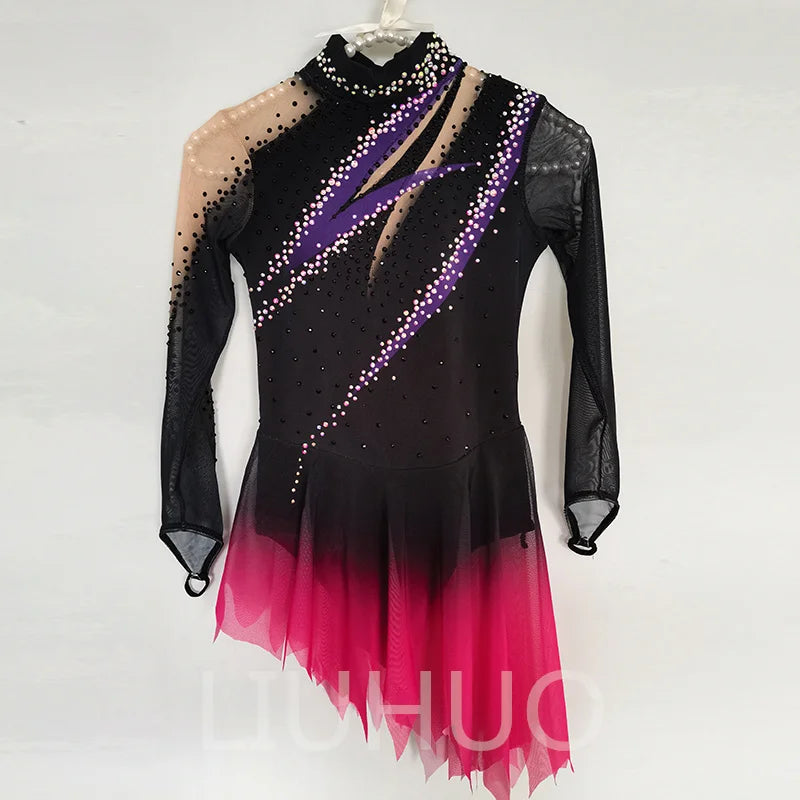 ❤ Features:This LIUHUO skating dress is a striking piece. It features a high - neck design with long, sheer sleeves. The bodice is predominantly black, adorned with an array of sparkling rhinestones. Vivid purple accents create dynamic diagonal stripes, adding a bold contrast. The skirt showcases a gradient transition from black to pink, with an irregular hemline that enhances movement. Ideal for ice skating performances, it combines elegance and visual impact.