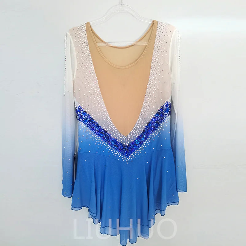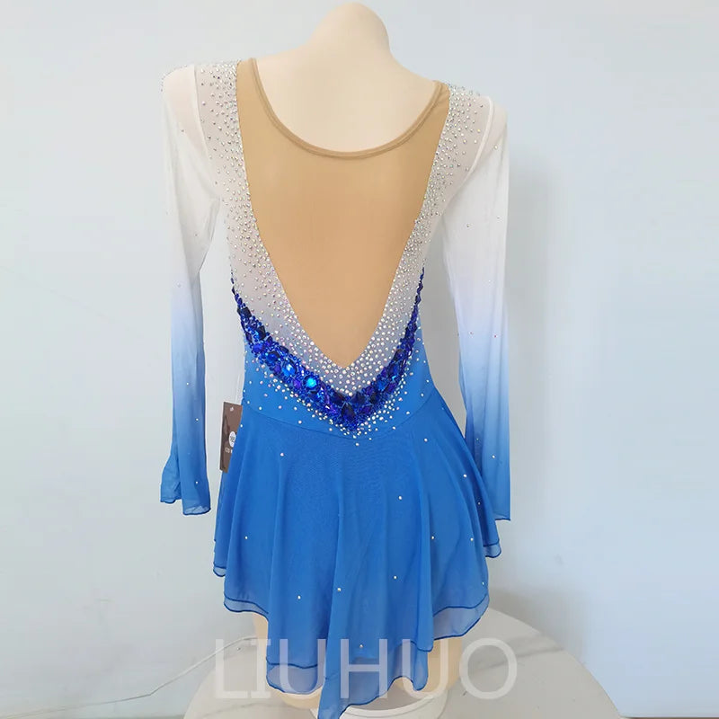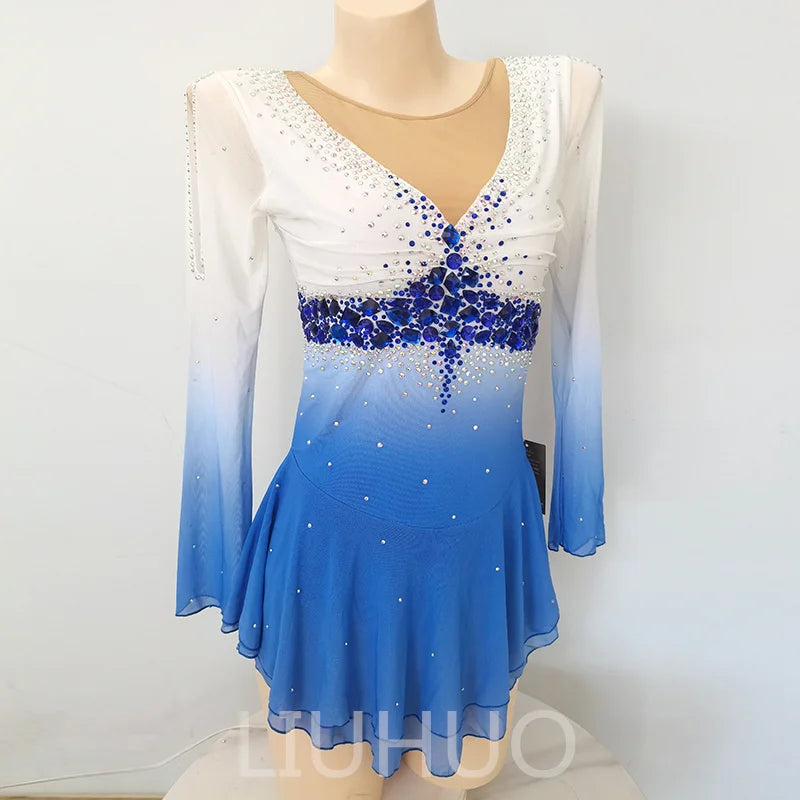 ❤ Features:This LIUHUO figure - skating dress is a graceful and glamorous piece. It features a gradient color scheme transitioning from white to blue, creating a serene and icy visual effect. The long - sleeved design includes sheer mesh sections at the upper part, adding an elegant touch. The bodice is lavishly decorated with numerous rhinestones in blue and clear, arranged in intricate patterns. The V - neckline and the gathered detail at the waist enhance the dress's feminine silhouette. The flared skirt allows for smooth movement, making it an ideal choice for figure - skating performances. This dress combines a soft color palette with elaborate embellishments, ensuring the skater looks elegant on the ice.