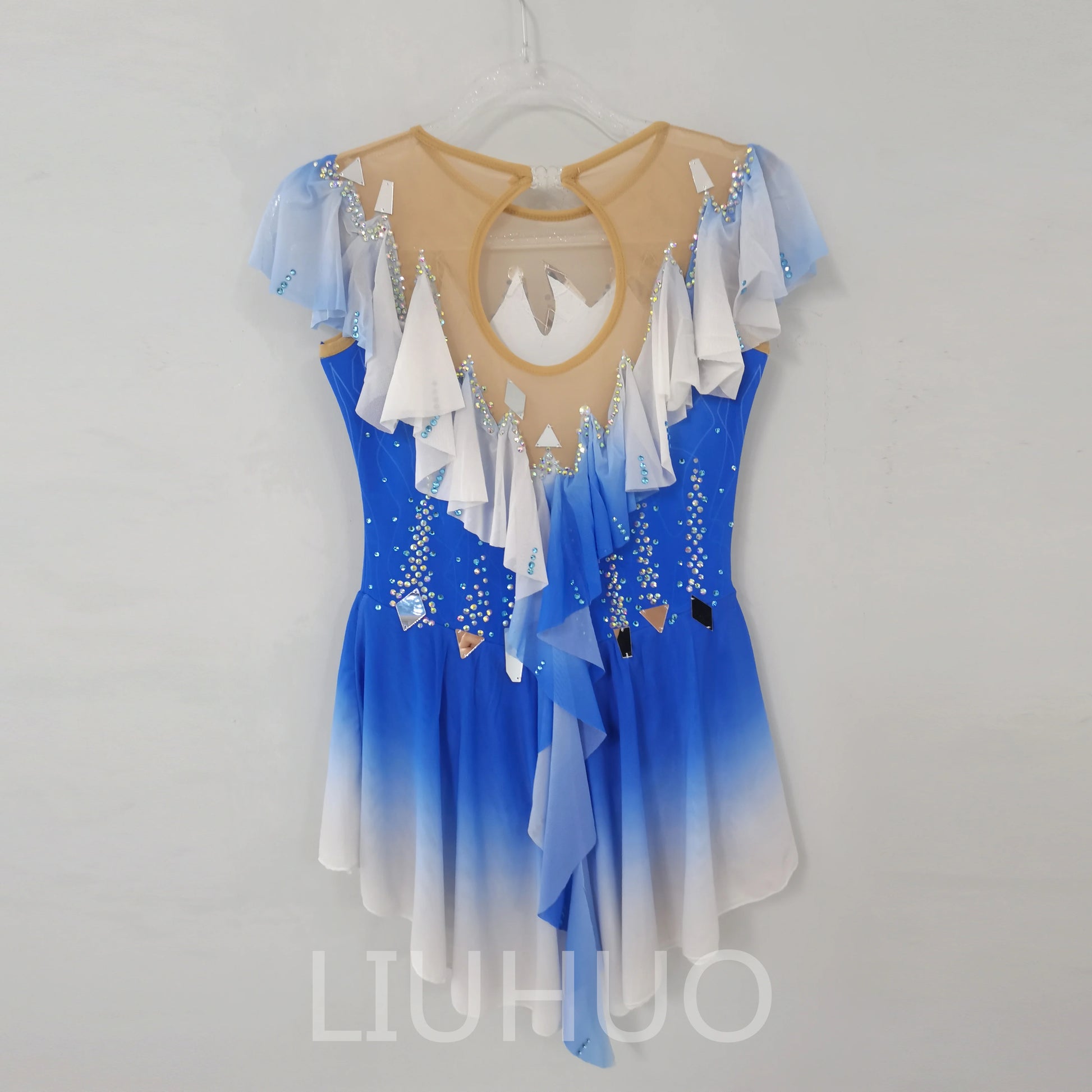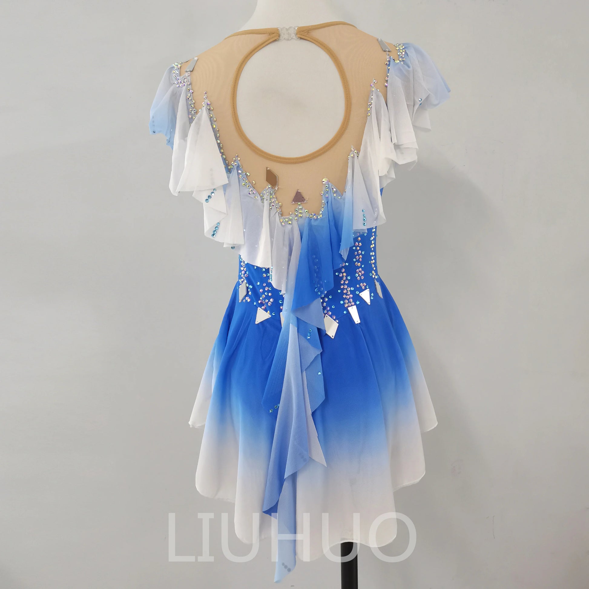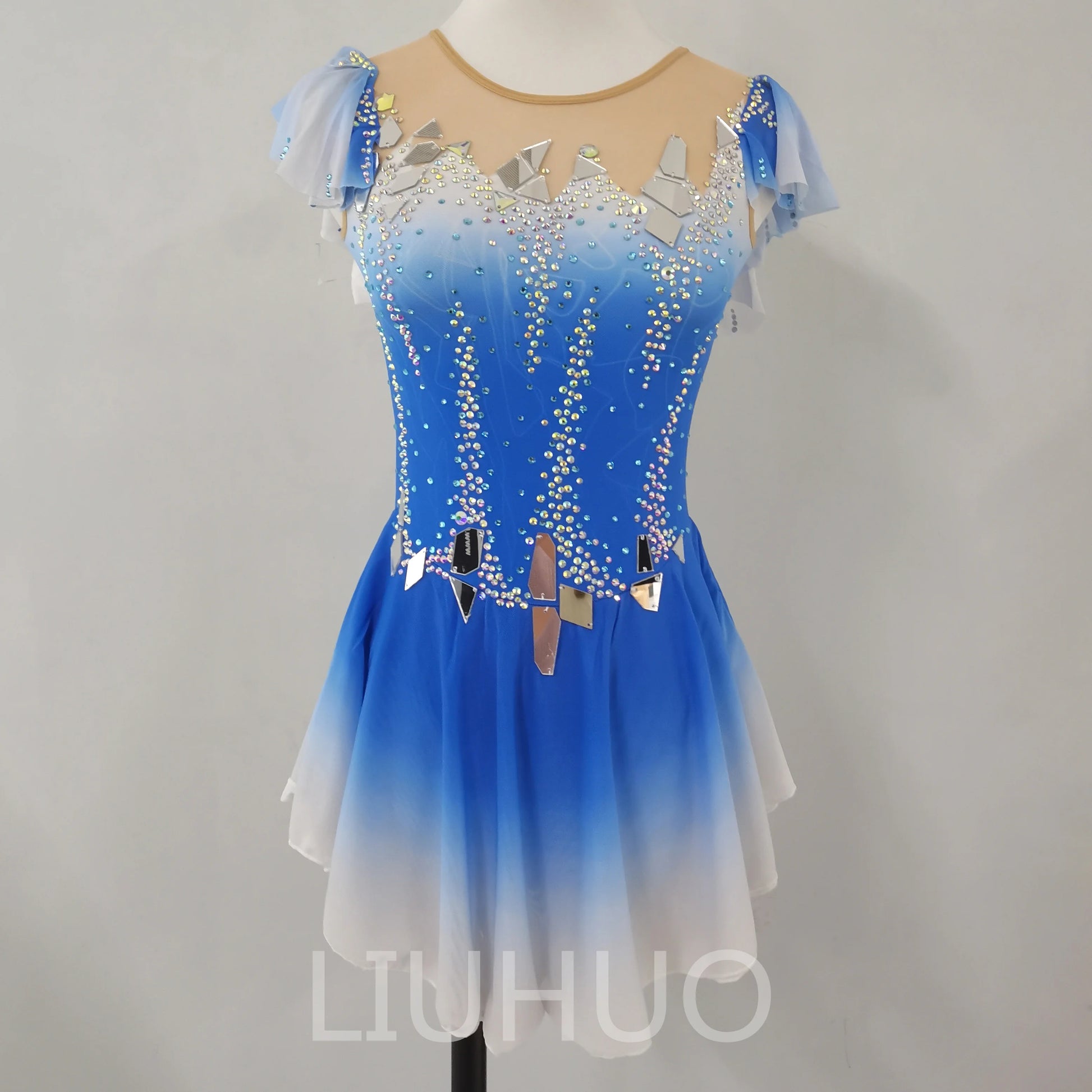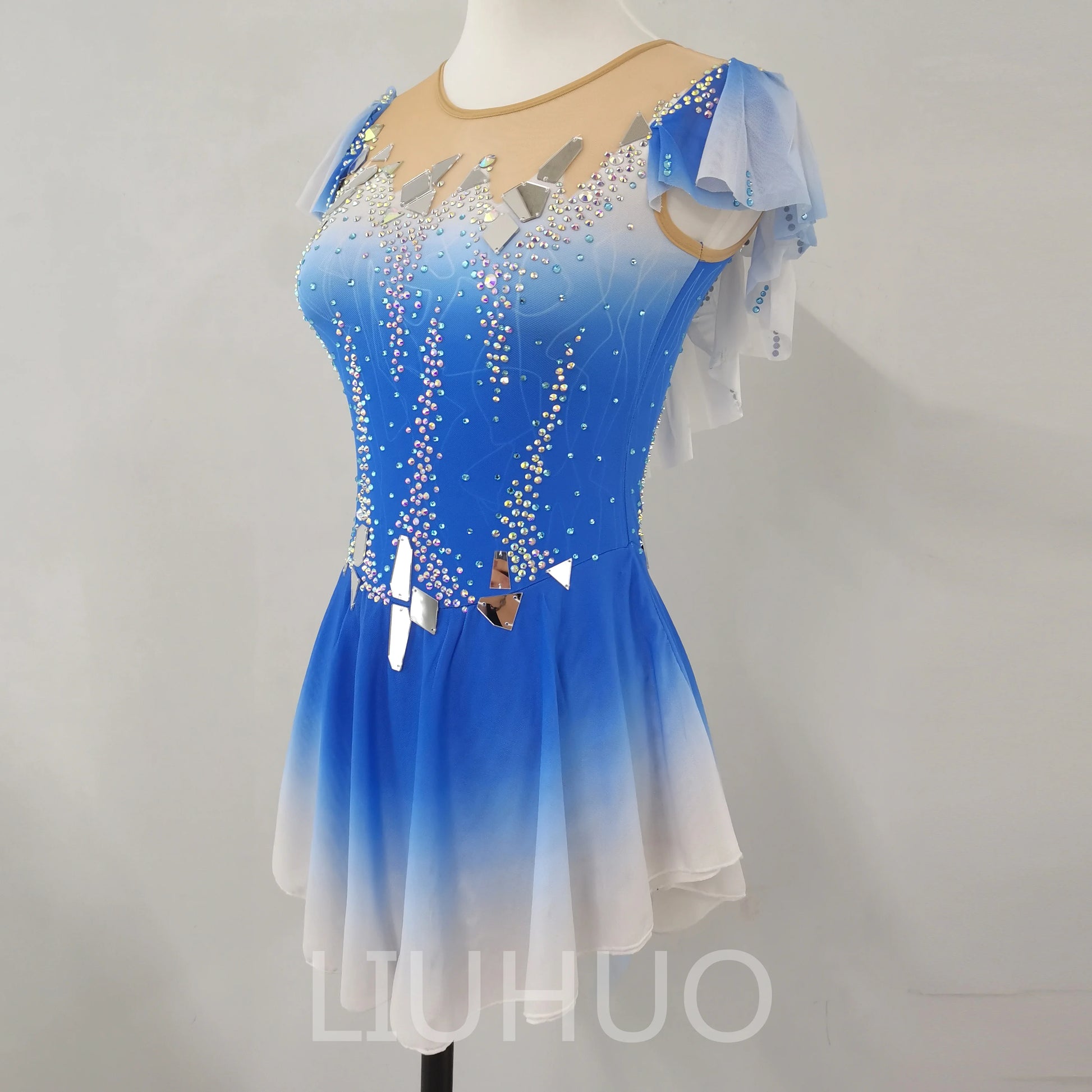❤ Features:This LIUHUO figure - skating dress is a captivating and stylish piece. In a blue gradient color transitioning from a deeper blue at the top to white at the bottom of the skirt, it creates a visually appealing effect. The short, fluttery sleeves add a delicate and graceful touch. The bodice is adorned with numerous sparkling rhinestones in various colors, meticulously arranged in patterns that enhance its glamour. Additionally, irregular metallic patches are incorporated, adding a modern and edgy element. The flared skirt allows for fluid movement, making it an excellent choice for figure - skating performances, combining elegance with contemporary design.