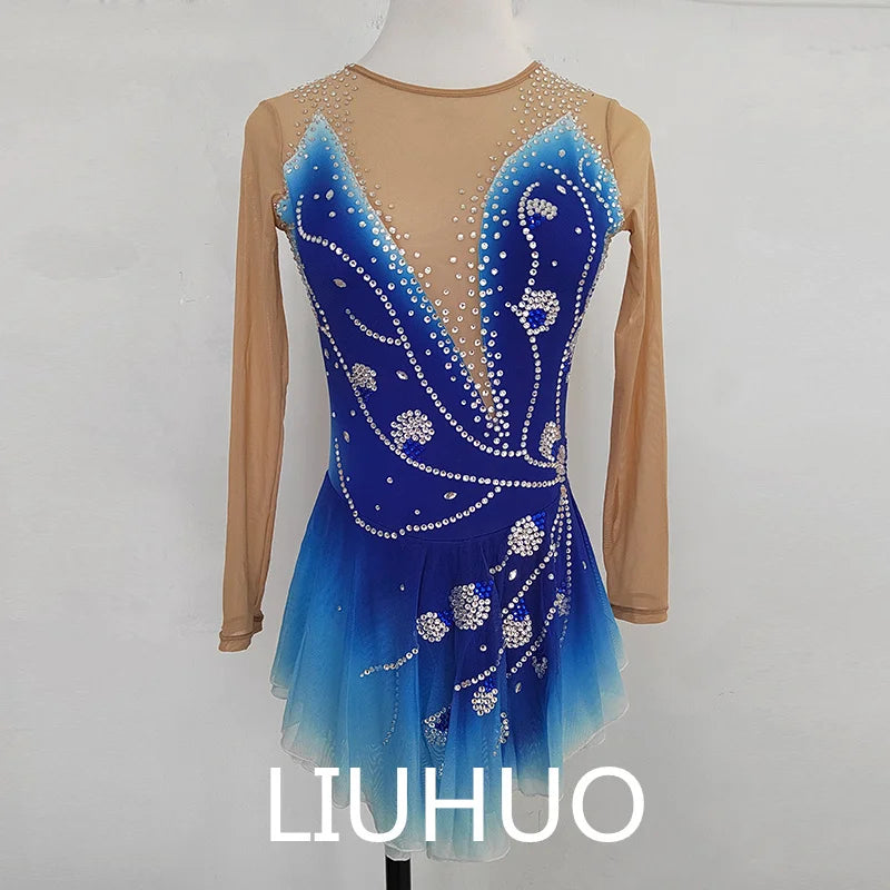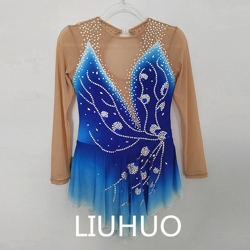 ❤ Features:This LIUHUO figure - skating dress is a striking and elegant creation. It showcases a gradient color scheme transitioning from deep blue at the top to lighter blue towards the bottom of the skirt, creating a visually appealing effect reminiscent of the ocean. The long - sleeved design features sheer mesh sleeves in a nude tone, adding a delicate and sophisticated touch. The bodice is lavishly adorned with numerous sparkling rhinestones meticulously arranged in a pattern that resembles flowing waves or intricate vines, enhancing the dress's glamorous appeal. The flared skirt allows for graceful movement, making it an ideal choice for figure - skating performances, combining both aesthetic beauty and functional design.