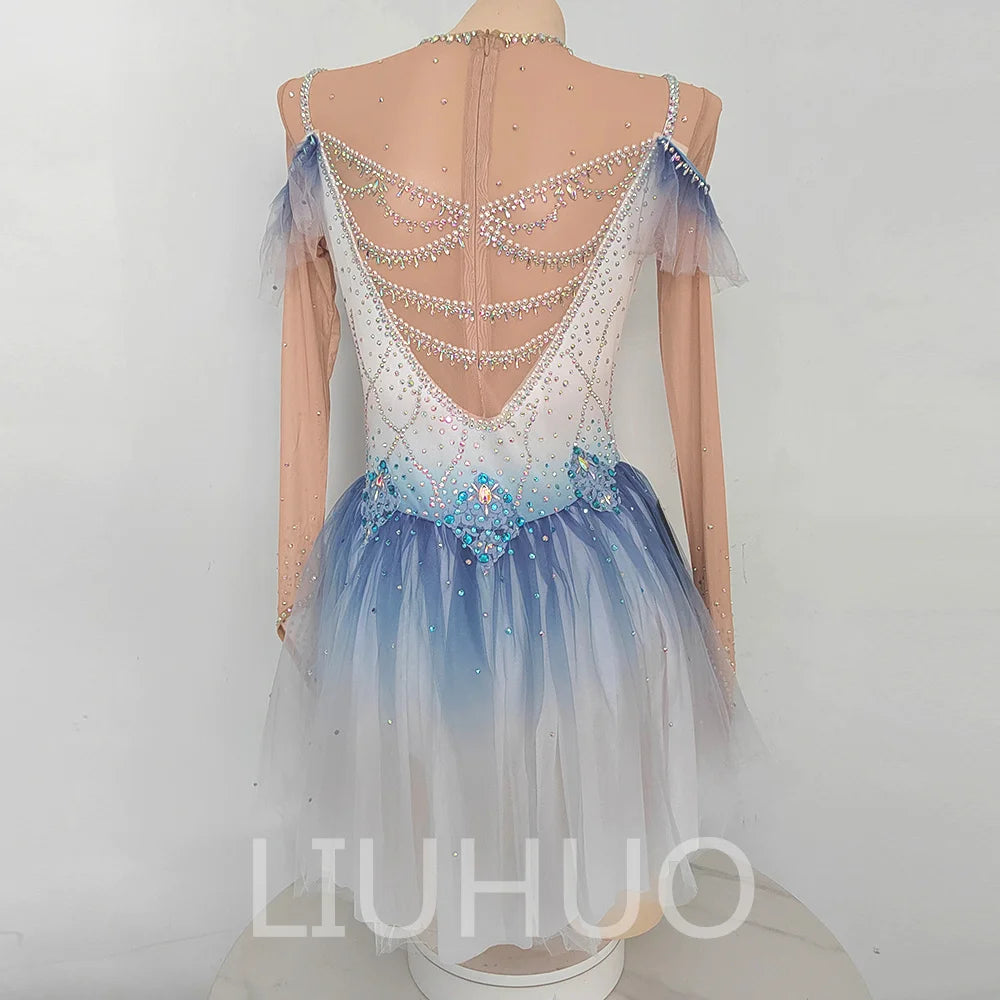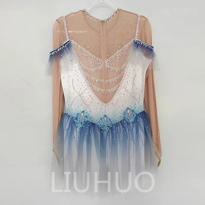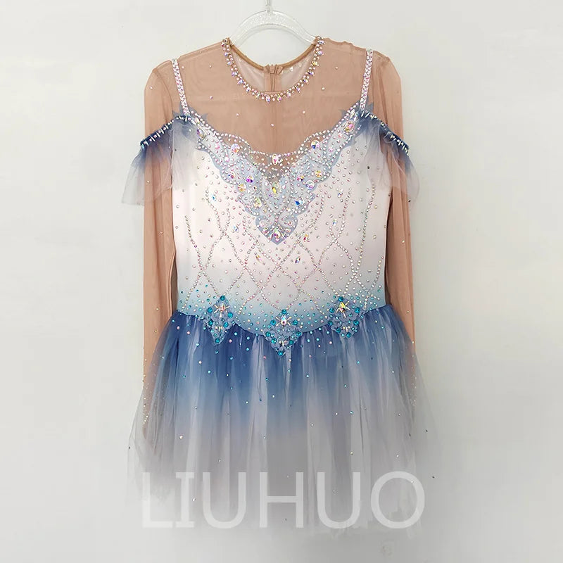 ❤ Features:This LIUHUO figure - skating dress is a stunning and ethereal creation. It features a gradient color scheme transitioning from white to blue, giving it an icy, celestial appearance. The off - the - shoulder design with sheer mesh sleeves adds a delicate and elegant touch. The bodice is lavishly adorned with numerous multicolored rhinestones arranged in intricate patterns, including a prominent heart - shaped motif at the center, enhancing its glamorous appeal. The skirt is made of flowing tulle, which allows for graceful movement, making it an ideal choice for figure - skating performances. This dress combines a soft color palette with elaborate embellishments, ensuring the skater looks like a vision on the ice.