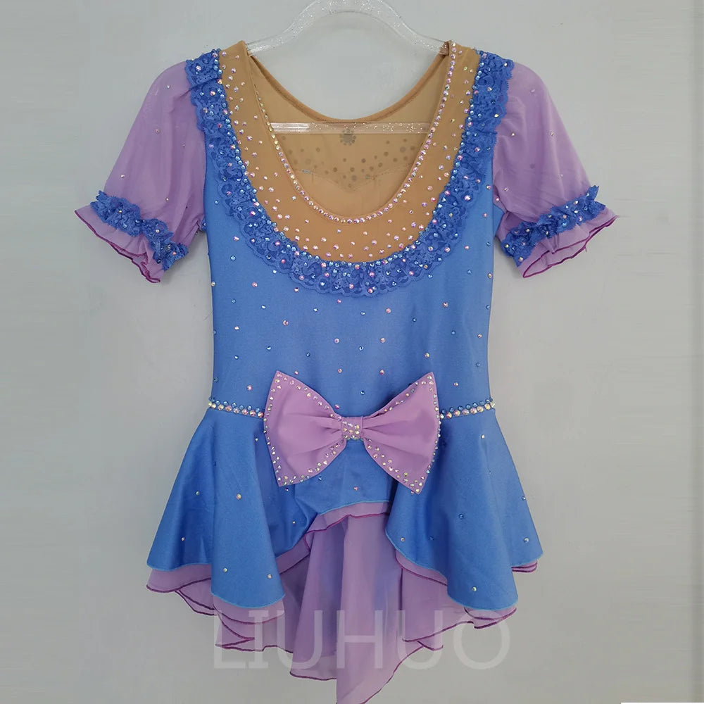 ❤ Features:This LIUHUO figure - skating dress is a charming and elegant piece. It features a light blue base color with a gradient effect, transitioning to a soft purple at the edges of the skirt and sleeves. The short, puffed sleeves are made of sheer purple fabric, adding a delicate and whimsical touch. The bodice is adorned with a large, eye - catching blue bow at the center, surrounded by an array of sparkling rhinestones in various colors. Ruffled lace details enhance the dress's femininity, and the flared skirt allows for graceful movement, making it a delightful choice for figure - skating, especially suitable for younger skaters or themed performances.