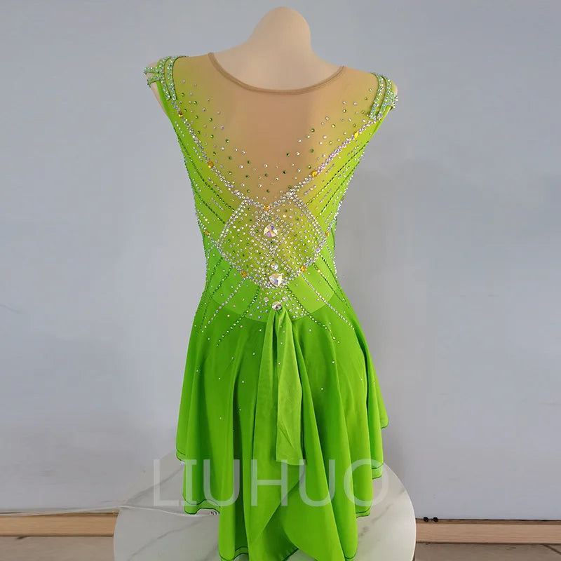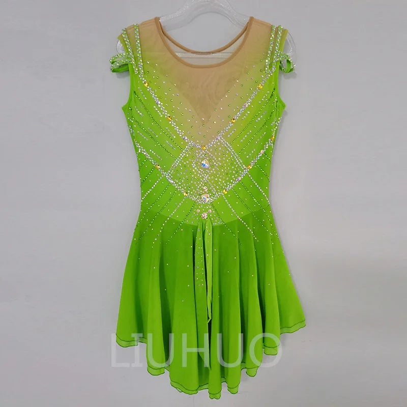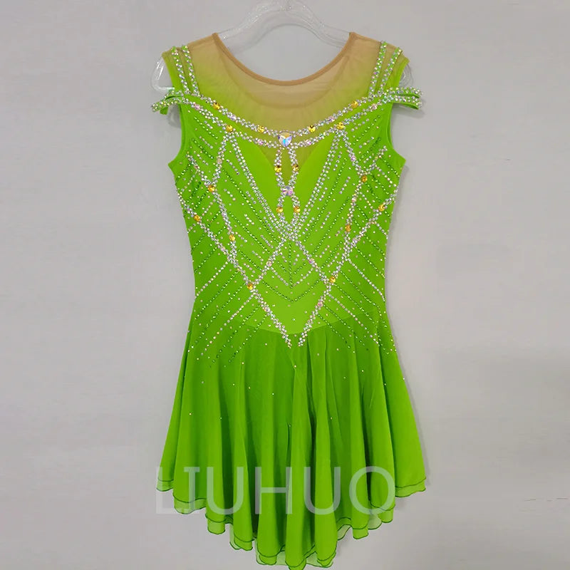 ❤ Features:This LIUHUO figure - skating dress is a vibrant and eye - catching piece. In a bright green color, it features a sleeveless design with a sheer mesh neckline, adding an elegant and delicate touch. The bodice is lavishly adorned with numerous sparkling rhinestones arranged in intricate geometric patterns, creating a dazzling effect. The flared skirt allows for graceful movement, making it both stylish and practical for figure - skating performances. This dress combines a bold color with elaborate detailing, ensuring the skater stands out on the ice.