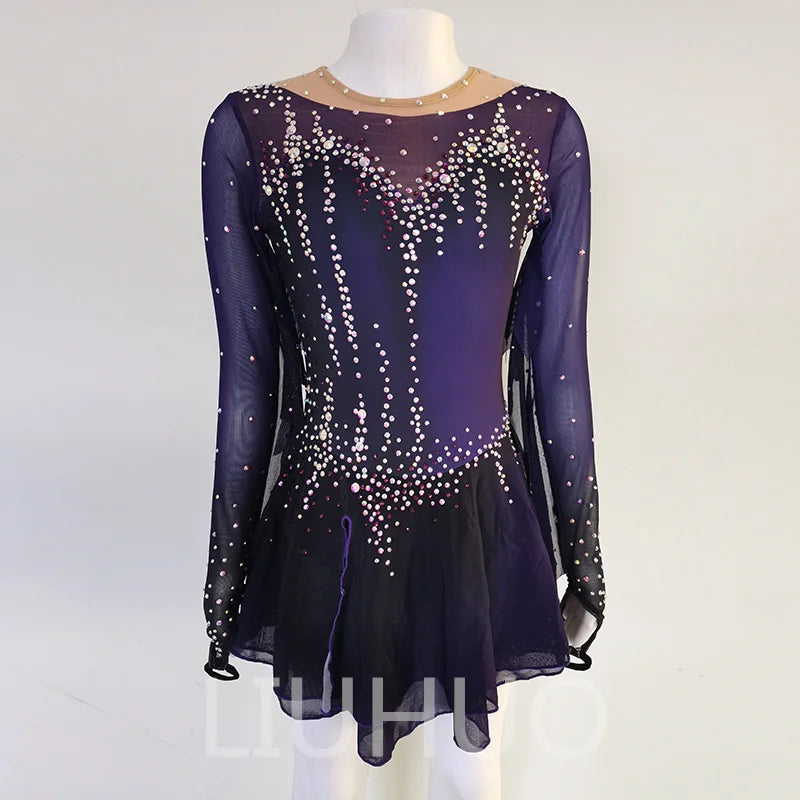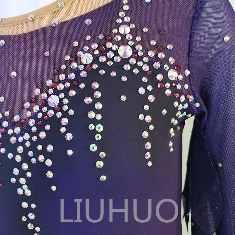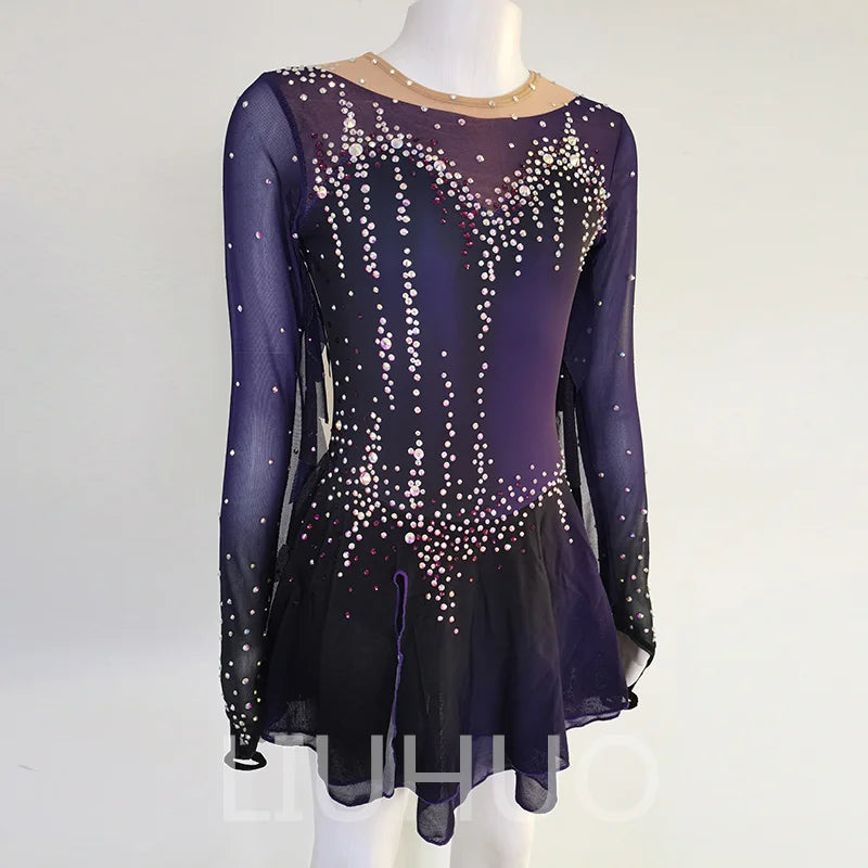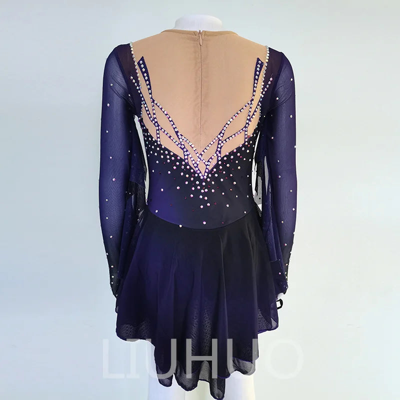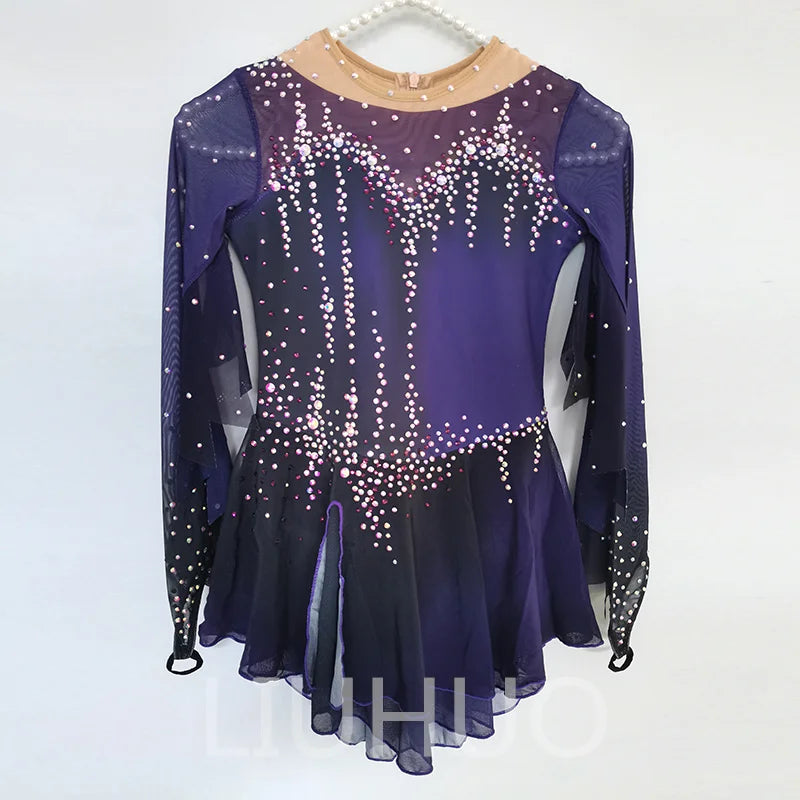 ❤ Features:This LIUHUO skating dress is a stunning piece. It features a gradient of deep purples, transitioning from a darker shade at the bottom to a lighter one on the top. The long, sheer sleeves add an elegant touch, while the bodice is adorned with numerous sparkling rhinestones, creating a dazzling pattern that catches the light beautifully. The flared skirt provides a graceful flow, making it perfect for both performance and practice on the ice.