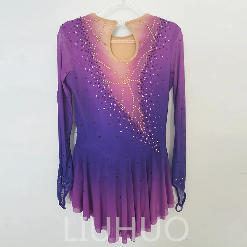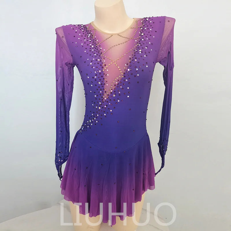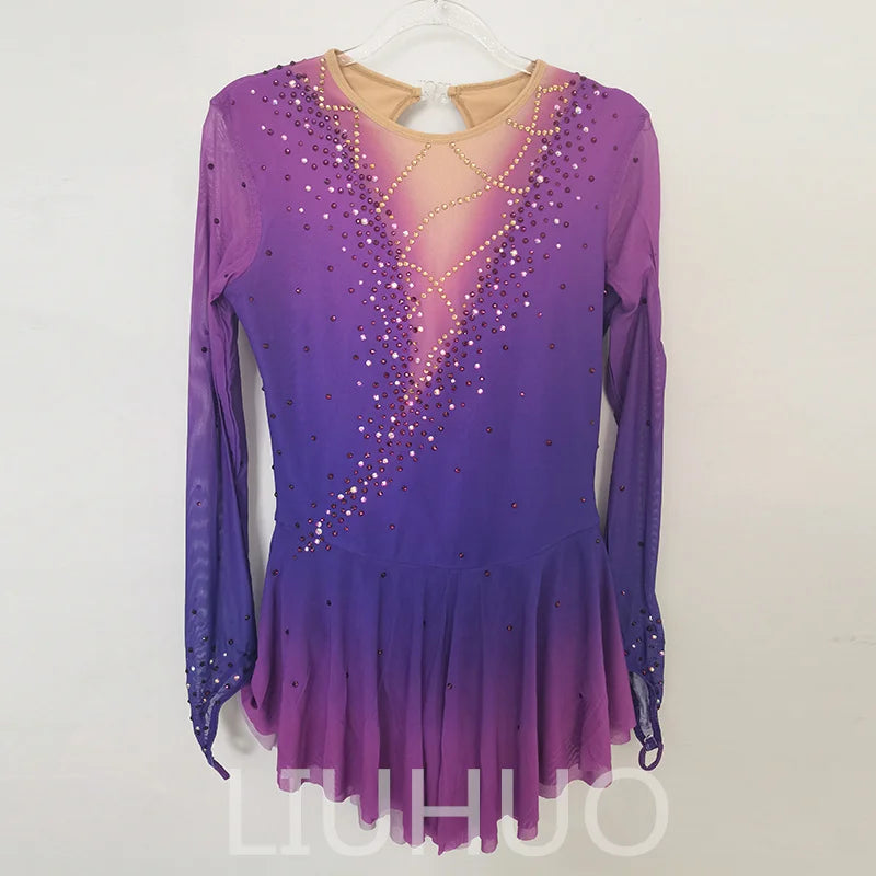 ❤ Features:This LIUHUO figure - skating dress is a captivating and glamorous piece. It showcases a gradient color scheme transitioning from deep purple at the top to lighter purple towards the bottom of the skirt, creating a rich and enchanting visual effect. The long - sleeved design with sheer mesh fabric adds an element of sophistication. The dress is densely adorned with numerous rhinestones meticulously arranged in patterns that enhance its sparkle. The crisscross straps at the neckline add a unique design detail. The flared skirt allows for graceful movement, making it an ideal choice for figure - skating performances, combining both aesthetic allure and practical functionality.