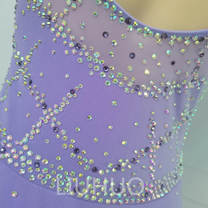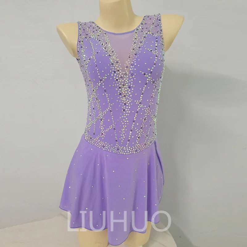 ❤ Features:This LIUHUO figure - skating dress is a vision of elegance and sparkle. In a soft lavender hue, it features a sleeveless design with a sheer mesh upper section. The bodice is lavishly adorned with numerous rhinestones meticulously arranged in geometric patterns, creating a dazzling effect that catches the light from every angle. The skirt is simple yet flowing, allowing for graceful movement during performances. This dress combines a delicate color with elaborate embellishments, making it a perfect choice for figure - skaters looking to make a statement on the ice.