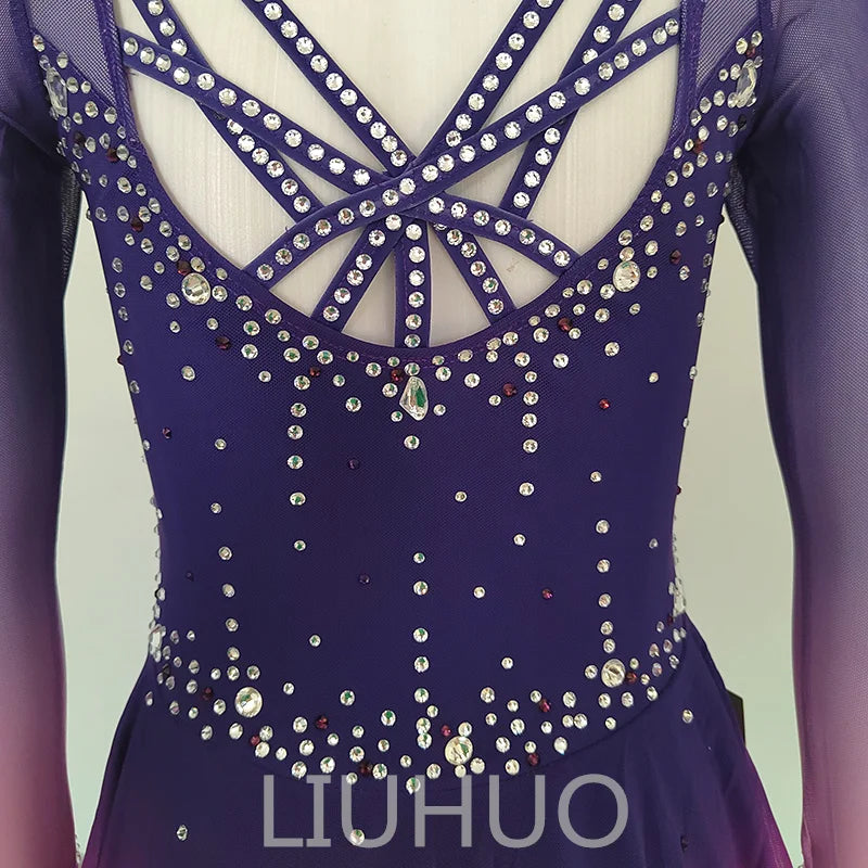 ❤ Features:This LIUHUO figure - skating dress is a captivating and elegant piece. It features a gradient color scheme transitioning from deep purple at the top to pink at the bottom of the skirt, creating a dreamy and enchanting visual effect. The long - sleeved design with sheer mesh fabric adds a delicate and sophisticated touch. The dress is adorned with numerous sparkling rhinestones meticulously arranged in patterns that outline the bodice and sleeves, enhancing its glamorous appeal. The flared skirt allows for graceful movement, making it an ideal choice for figure - skating performances, combining both aesthetic beauty and practical functionality.