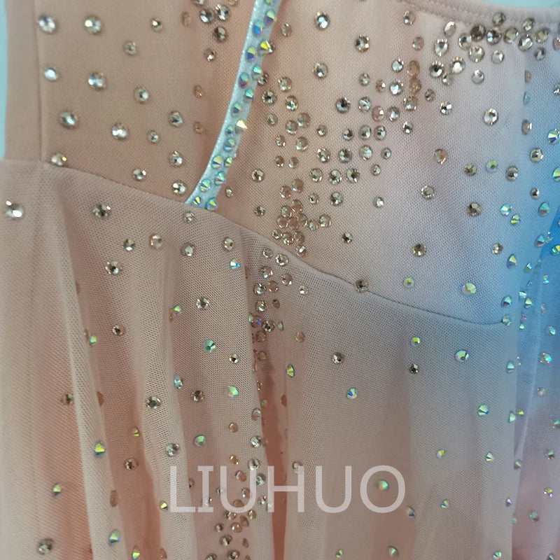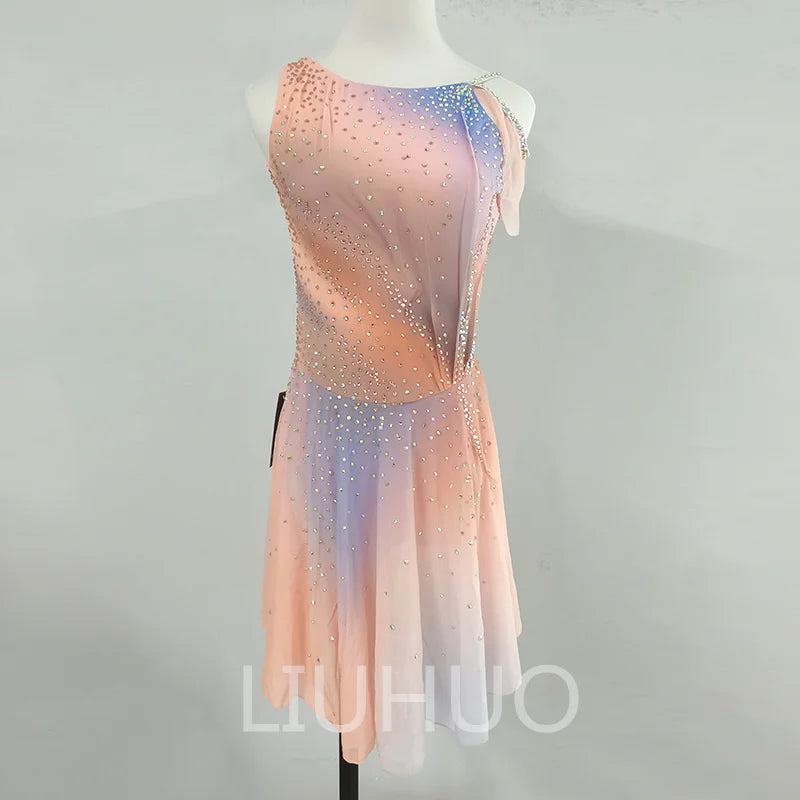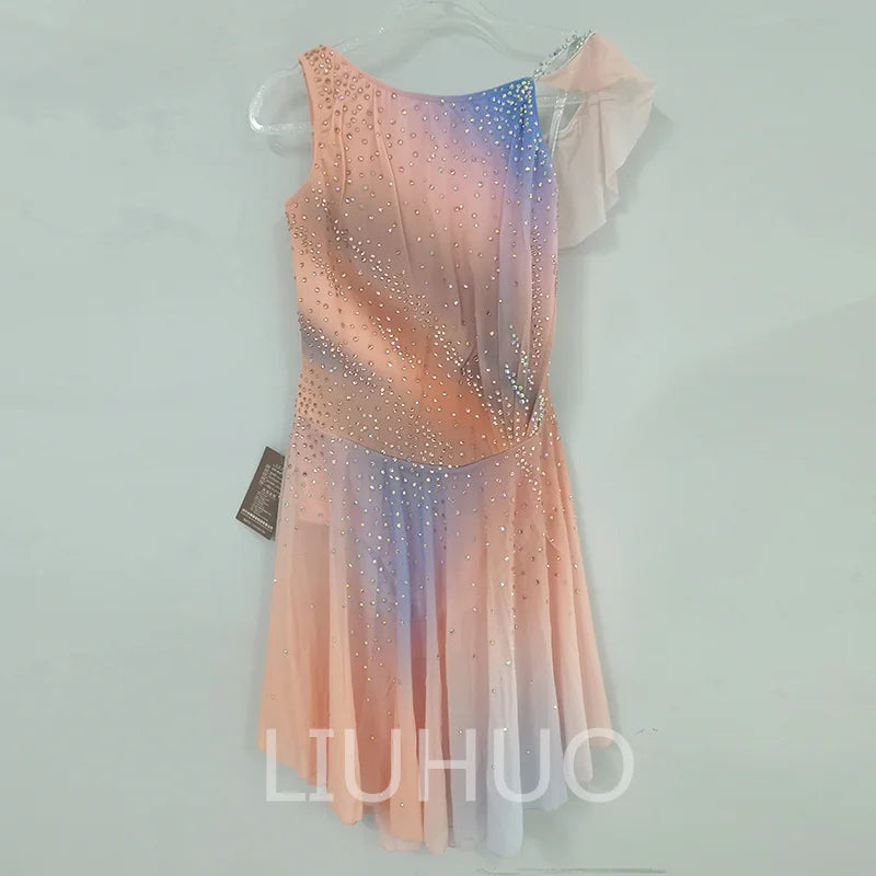 ❤ Features:This LIUHUO figure - skating dress is a charming and elegant piece. In a soft gradient of pastel colors including pink, peach, and hints of blue, it exudes a gentle and dreamy aesthetic. The sleeveless design with an asymmetric shoulder adds a modern and stylish touch. The entire dress is adorned with numerous sparkling rhinestones, meticulously arranged to create a pattern that enhances its beauty. The flared skirt allows for graceful movement, making it an ideal choice for figure - skating performances. This dress combines a delicate color palette with intricate embellishments, ensuring the skater looks both elegant and eye - catching on the ice.