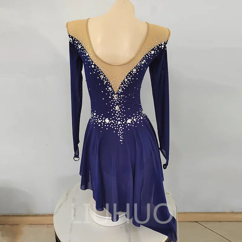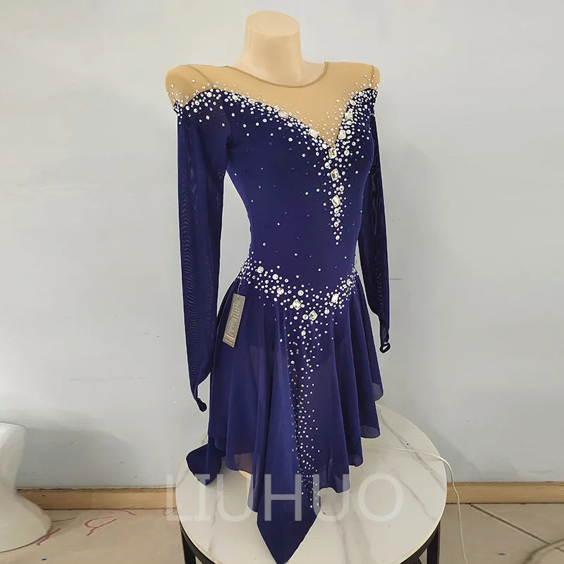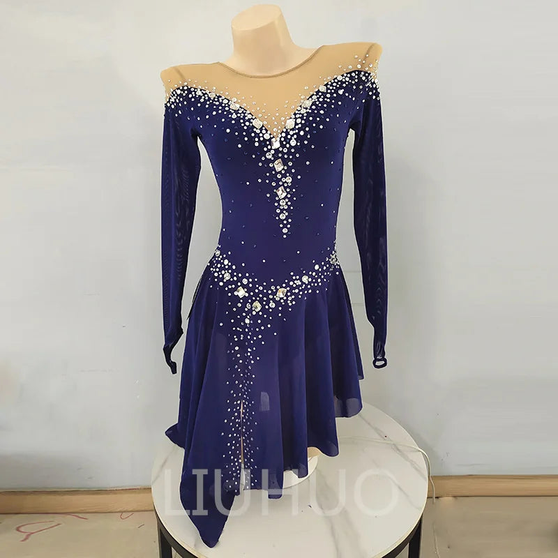 ❤ Features:This LIUHUO figure - skating dress exudes elegance. In a deep blue hue, it features long sleeves and an off - the - shoulder sheer mesh neckline, adding a touch of sophistication. The bodice is lavishly adorned with numerous sparkling rhinestones, meticulously arranged in patterns that cascade down from the neckline to the waist and along the skirt. The flared skirt allows for graceful movement, making it a perfect blend of style and functionality, ideal for figure - skating performances.