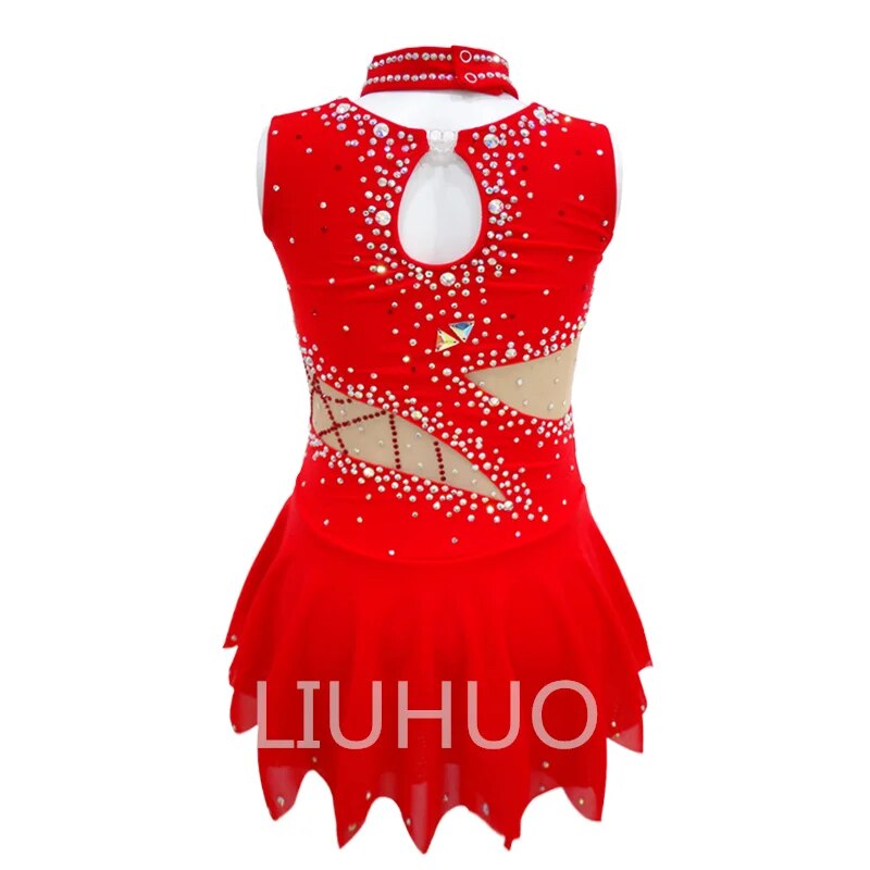 ❤ Features:This is a figure - skating dress from the brand LIUHUO. It is a vibrant red color with a sleeveless design. The neckline is decorated with multiple layers of rhinestones. The dress is covered with sparkling rhinestones, forming an exquisite pattern. There is a section of nude - colored mesh fabric for added design flair. The skirt has a ruffled hem, which is light and dynamic, making it suitable for showcasing vitality and elegance during figure - skating performances.