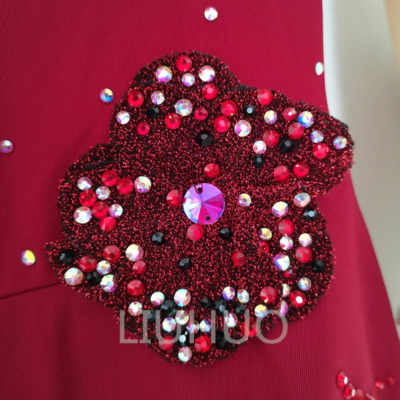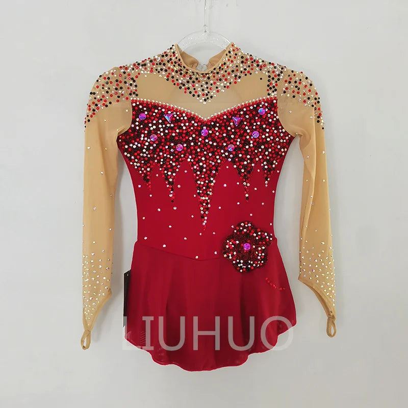 ❤ Features:This LIUHUO figure - skating dress is a striking and glamorous creation. In a deep red hue, it features a high - neck design with sheer mesh sleeves, adding an elegant and somewhat mysterious allure. The bodice is densely adorned with a profusion of rhinestones in various colors, including black, white, and purple, meticulously arranged in patterns that cascade down from the neckline. A large, intricately embellished floral - like motif on the skirt adds a focal point of sparkle. This dress combines bold color with elaborate detailing, making it a perfect choice for figure - skating performances, ensuring the wearer stands out on the ice.