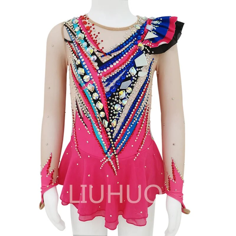❤ Features:This LIUHUO figure - skating dress is a vibrant and eye - catching piece. The main body is in a bright pink color. The bodice features a striking design with a variety of colorful rhinestones and beads arranged in geometric patterns, creating a dazzling effect. There is a one - shoulder ruffled detail in blue, black, and pink, adding a dynamic and stylish touch. The long, sheer sleeves are also adorned with embellishments that match the bodice. The flared skirt is simple yet elegant, making it perfect for showcasing graceful movements during figure - skating performances.