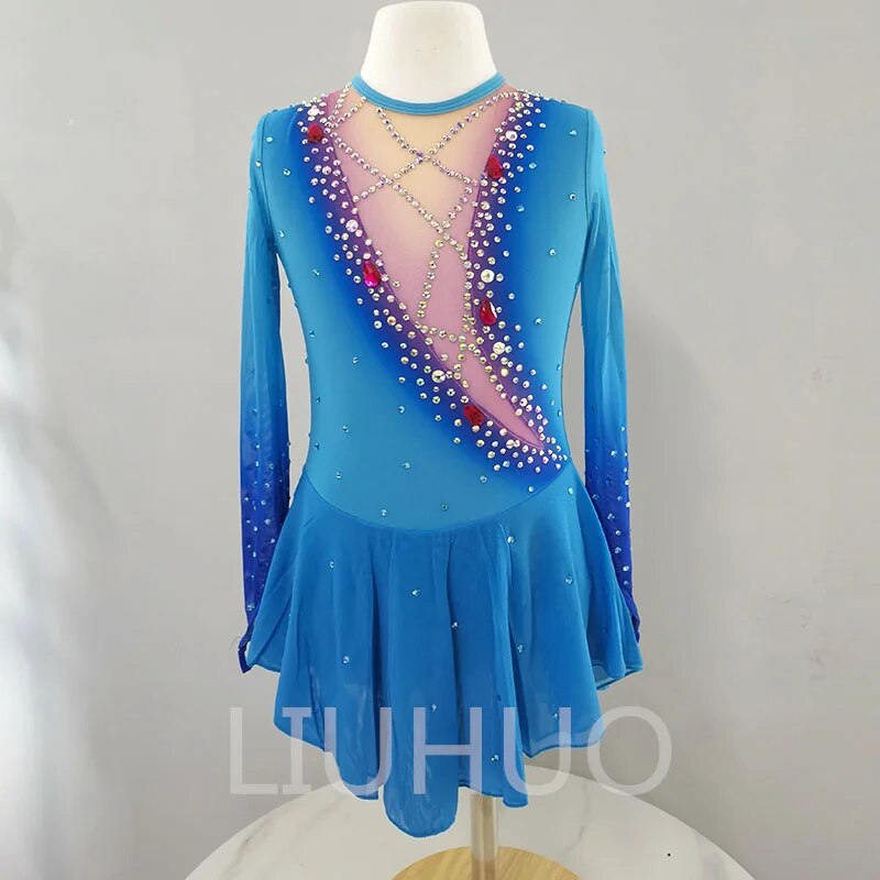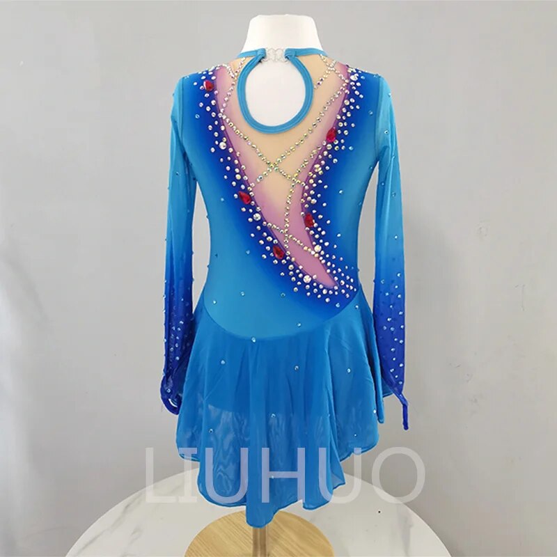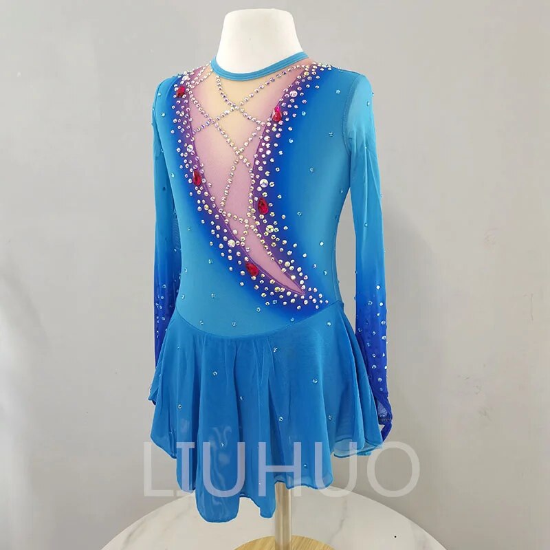 ❤ Features:This LIUHUO figure - skating dress is a striking creation. It showcases a vivid blue color with a gradient effect, transitioning to a lighter shade near the sleeves. The long - sleeved design is complemented by a sheer mesh panel on the chest, which is intricately adorned with sparkling rhinestones. The rhinestones are arranged in geometric patterns, with some red rhinestones adding a pop of contrast. The flared skirt allows for ease of movement, making it both stylish and practical for figure - skating performances.