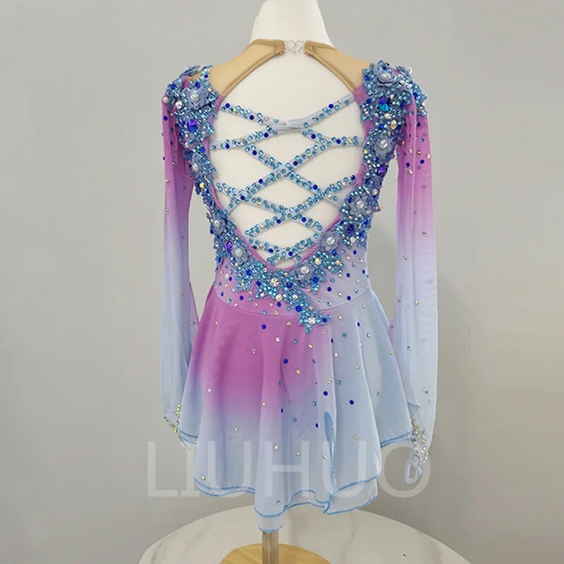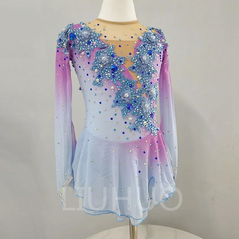 ❤ Features:This LIUHUO figure - skating dress is a masterpiece of design. It features a gradient color scheme transitioning from pink to light blue, creating a dreamy and ethereal look. The long - sleeved design includes sheer mesh sections on the upper part, adding an elegant touch. The bodice is lavishly decorated with large, elaborate floral - like patterns made up of blue rhinestones, interspersed with smaller, multicolored rhinestones across the entire dress. The flared skirt flows gracefully, making it an ideal choice for figure - skating, combining visual allure with performance - friendly functionality.