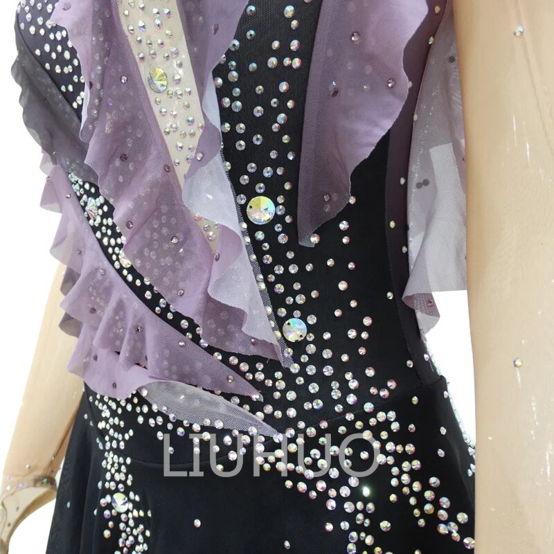 ❤ Features:This LIUHUO figure - skating dress is a captivating blend of elegance and style. The base color is black, with sheer, nude - toned long sleeves. The bodice is adorned with an eye - catching arrangement of purple ruffled fabric that cascades diagonally, creating a dynamic look. Sparkling rhinestones are meticulously placed across the dress, adding a touch of glamour. A ruffled detail on the shoulder enhances the dress's unique aesthetic, while the flared skirt allows for graceful movement on the ice, making it perfect for performances.