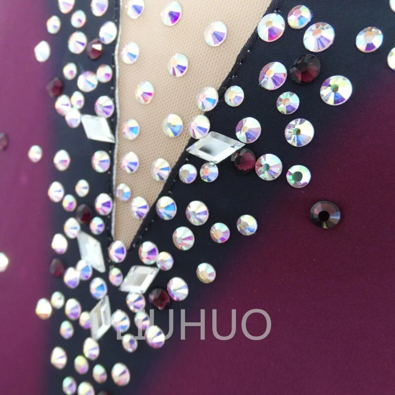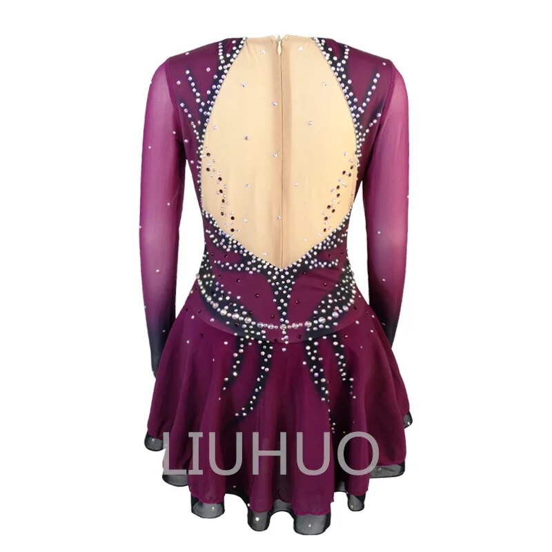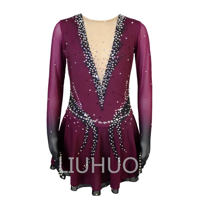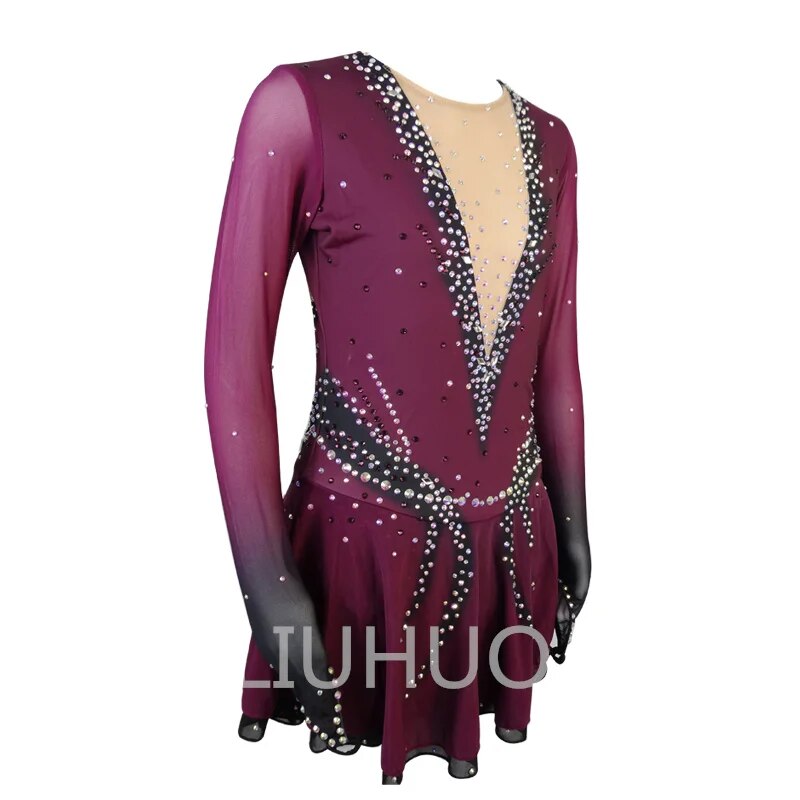 ❤ Features:This LIUHUO figure - skating dress is a masterpiece of elegance and style. In a rich burgundy hue, it features long sleeves with a subtle gradient to black at the cuffs. The bodice showcases a deep V - neckline, bordered by an array of sparkling rhinestones that create a striking contrast against the fabric. These rhinestones are also artistically arranged to form decorative patterns across the waist and skirt, adding a touch of glamour. The skirt itself is flared, allowing for ease of movement on the ice, making it perfect for both practice and performance.
