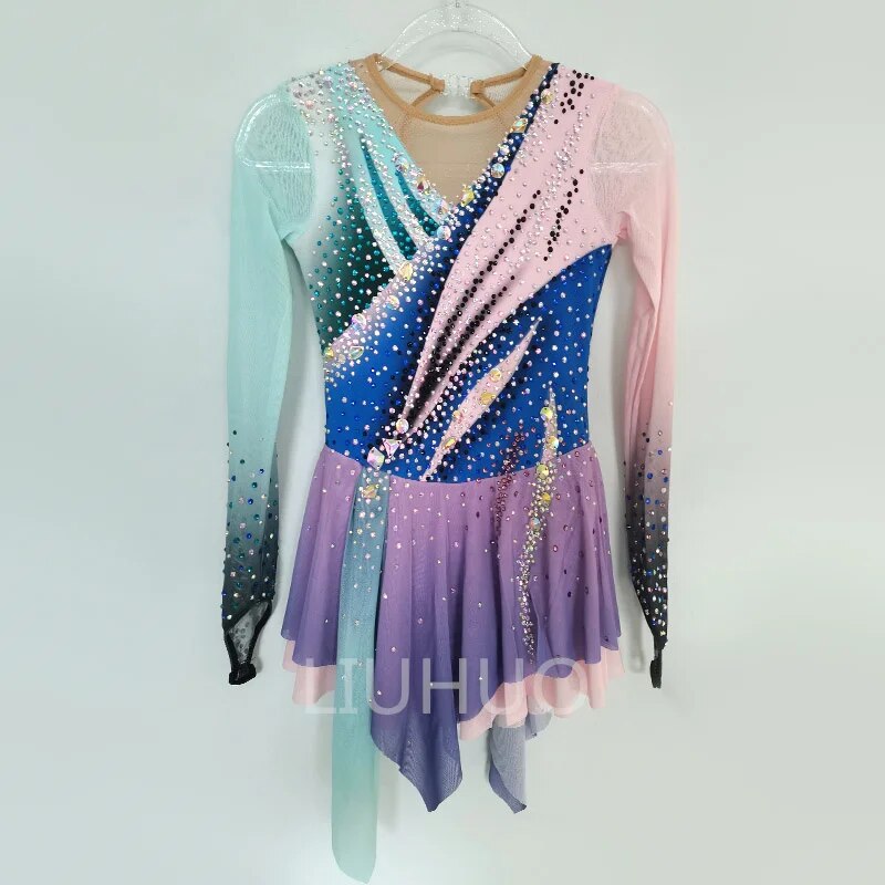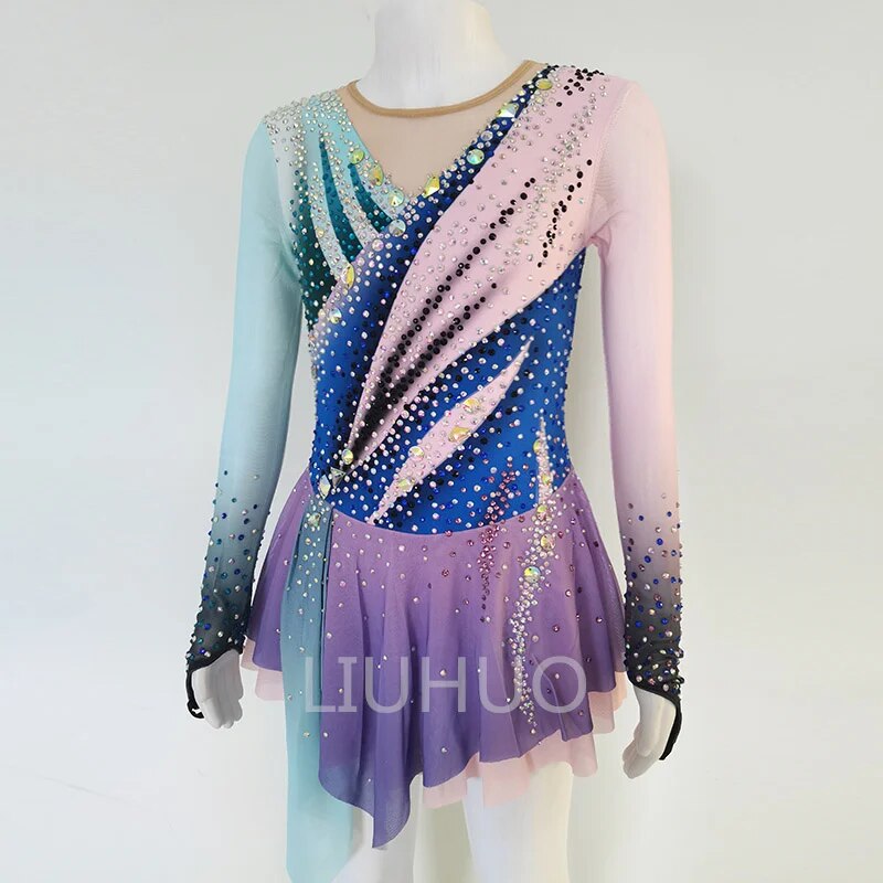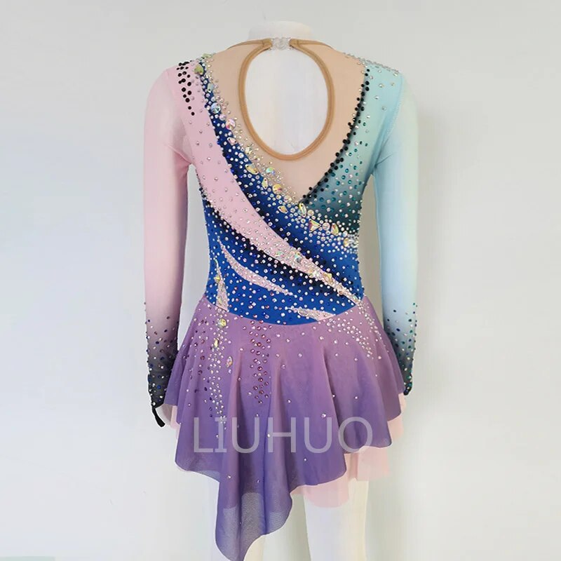 ❤ Features:This is a figure - skating dress from the brand LIUHUO. It is rich in color, with the long - sleeved part gradually changing from light blue to pink. The upper body is mainly blue, with decorative areas in pink, black, etc., all adorned with sparkling rhinestones that form a unique pattern. The skirt is purple and also embellished with rhinestones. The overall style is gorgeous, making it suitable for showcasing graceful postures during figure - skating performances.