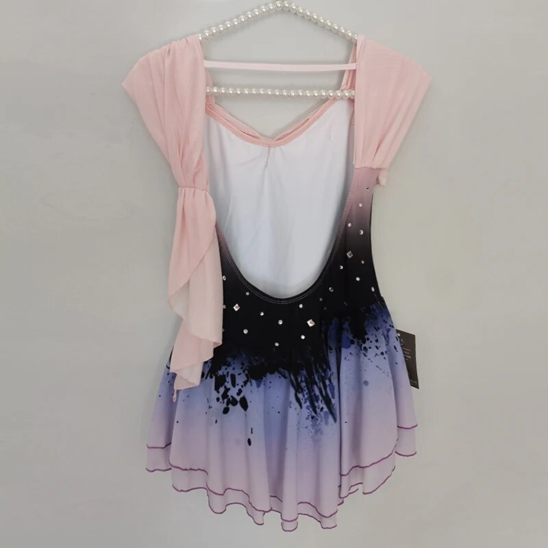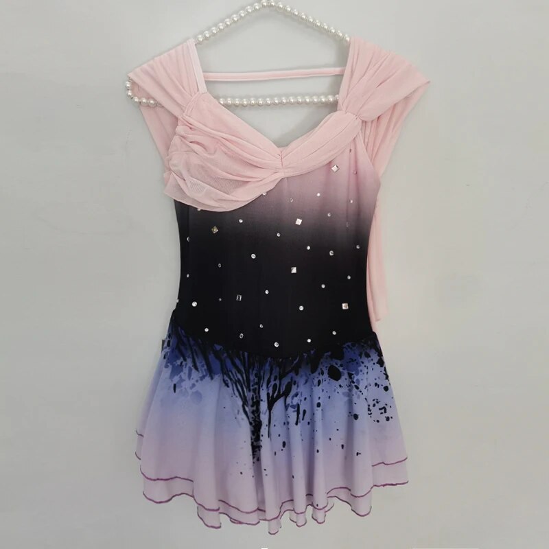 ❤ Features:This is a sleeveless figure - skating dress. It features a unique gradient design transitioning from pink at the top to black in the middle, and then to light purple at the bottom of the skirt. The bodice is adorned with small, sparkling rhinestones, adding a touch of glamour. One - shoulder strap is twisted and draped, creating a stylish and elegant look. The skirt has a flared hem with an artistic black splatter - like pattern, combining fashion and artistry, making it suitable for figure - skating performances.