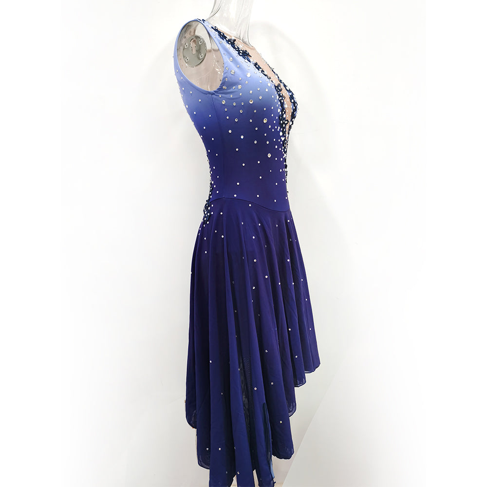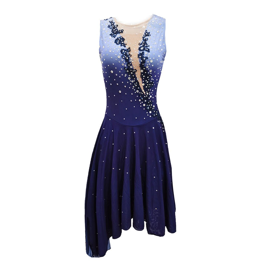 ❤ Features:This LIUHUO figure - skating dress is sleeveless, featuring a gradient from light to dark blue. The upper sheer panel is decorated with blue lace and sparkling rhinestones. The skirt has an asymmetric design, adding a unique touch, ideal for women and girls in skating performances.