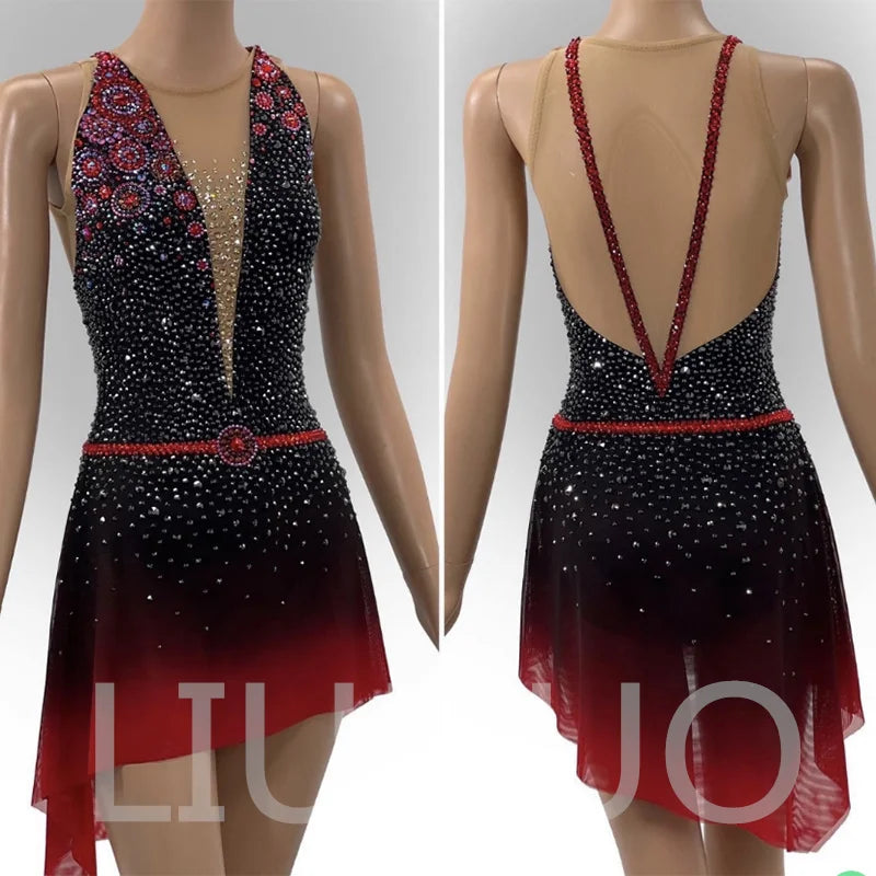 ❤ Features:This is a LIUHUO figure - skating dress. It has a gradient color from black to red, is densely decorated with crystals, features a deep V - neckline in the front and an open - back design, and has a red waistband, suitable for figure - skating performances.