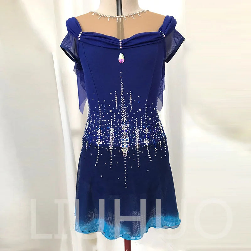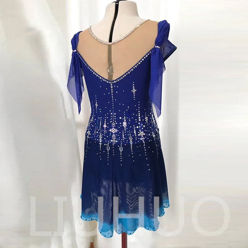 ❤ Features:This is a LIUHUO figure - skating dress. It is dark blue with a gradient light blue hem, decorated with crystals, has an off - shoulder design with short sheer sleeves, and a pendant detail on the chest, suitable for figure - skating performances.