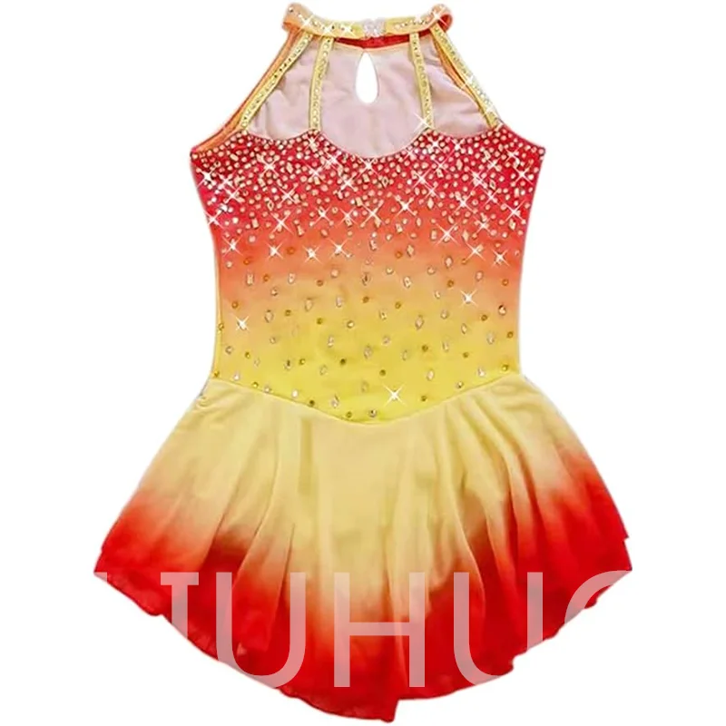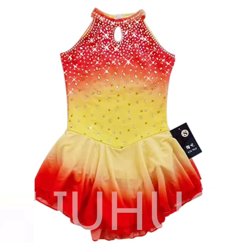 ❤ Features:This is a LIUHUO figure - skating dress. It has a gradient color from red to yellow, a sleeveless high - neck design, and is decorated with many crystals, suitable for figure - skating performances.