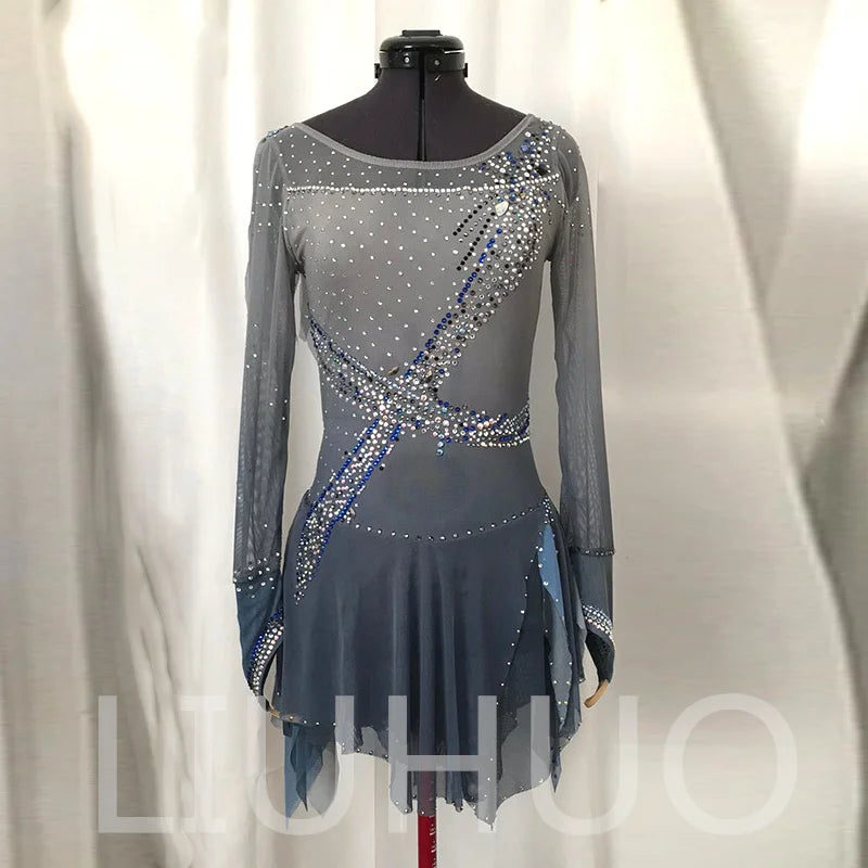❤ Features:This is a LIUHUO figure - skating dress. It is gray, decorated with crystals and blue rhinestones in a decorative pattern, has long sheer sleeves, and an asymmetrical skirt, suitable for figure - skating performances, and can be customized as a competition or performance outfit for children and adult women.