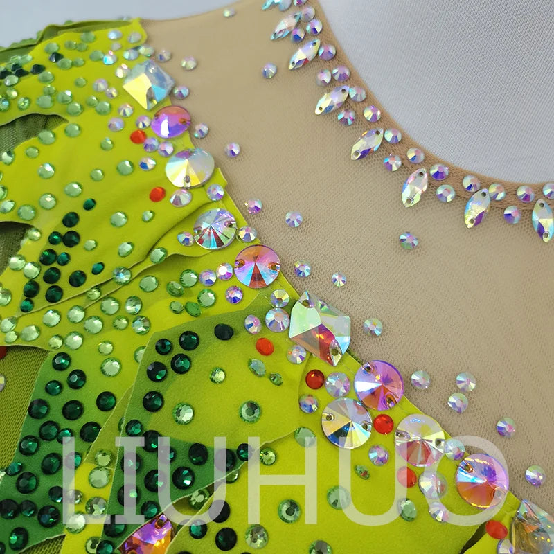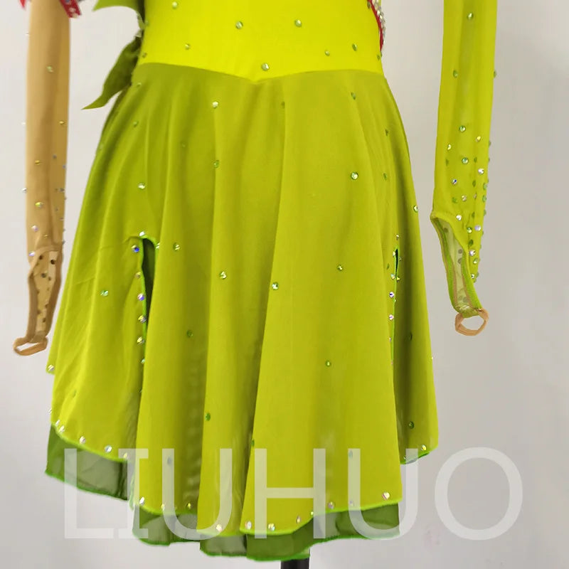 ❤ Features:This is a LIUHUO - brand figure skating performance dress. It is mainly green, featuring a one - shoulder and mesh - spliced design, decorated with leaf shapes, rhinestones, and a red waist belt. It is a customized figure skating dress for children or adult women, suitable for performance scenarios.