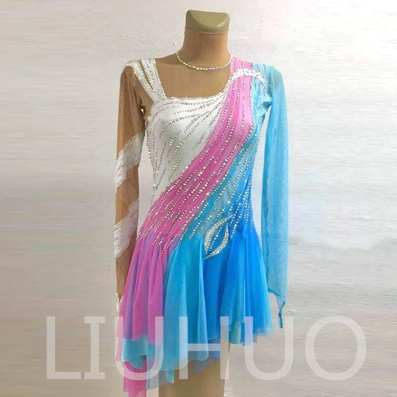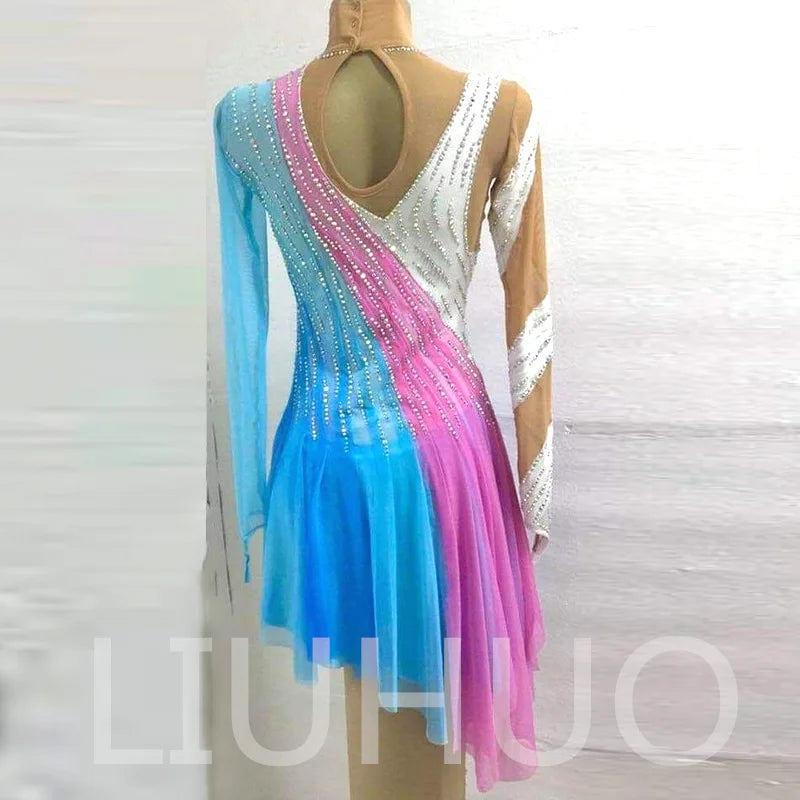 ❤ Features:This is a LIUHUO figure - skating dress. It has a colorful, gradient - like color scheme, with one - shoulder and asymmetrical sleeve designs, decorated with numerous crystals, suitable for figure - skating performances.