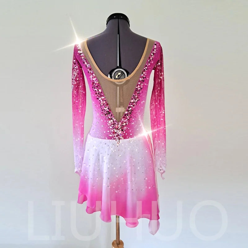 ❤ Features:This is a LIUHUO figure - skating dress. It has a gradient color from pink to white, decorated with a large number of crystals, long sleeves, and an asymmetrical skirt, suitable for figure - skating performances.