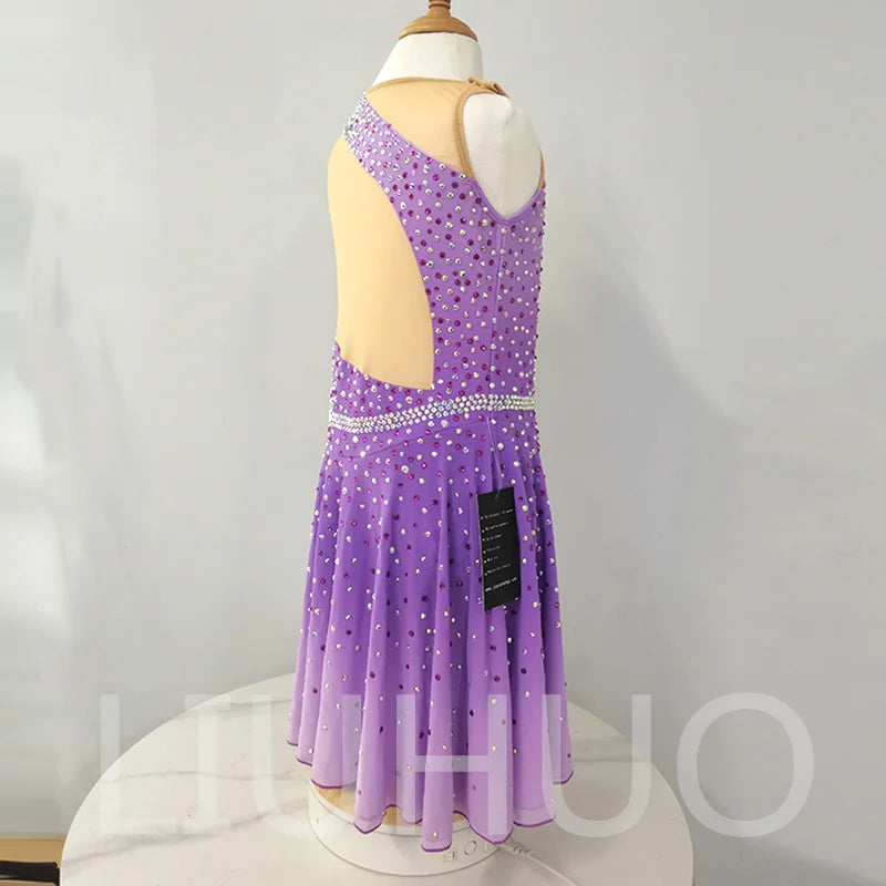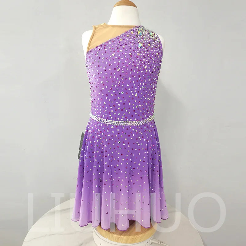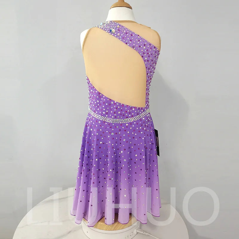 ❤ Features:This is a LIUHUO figure - skating dress. It's purple, with one - shoulder design, decorated with many crystals, and has a sparkling waistband, suitable for figure - skating performances.