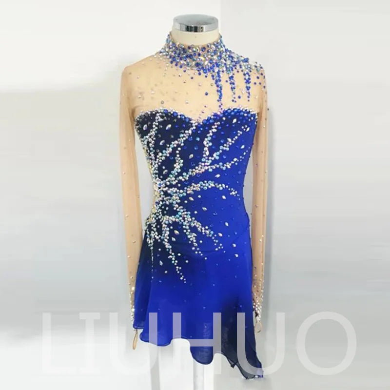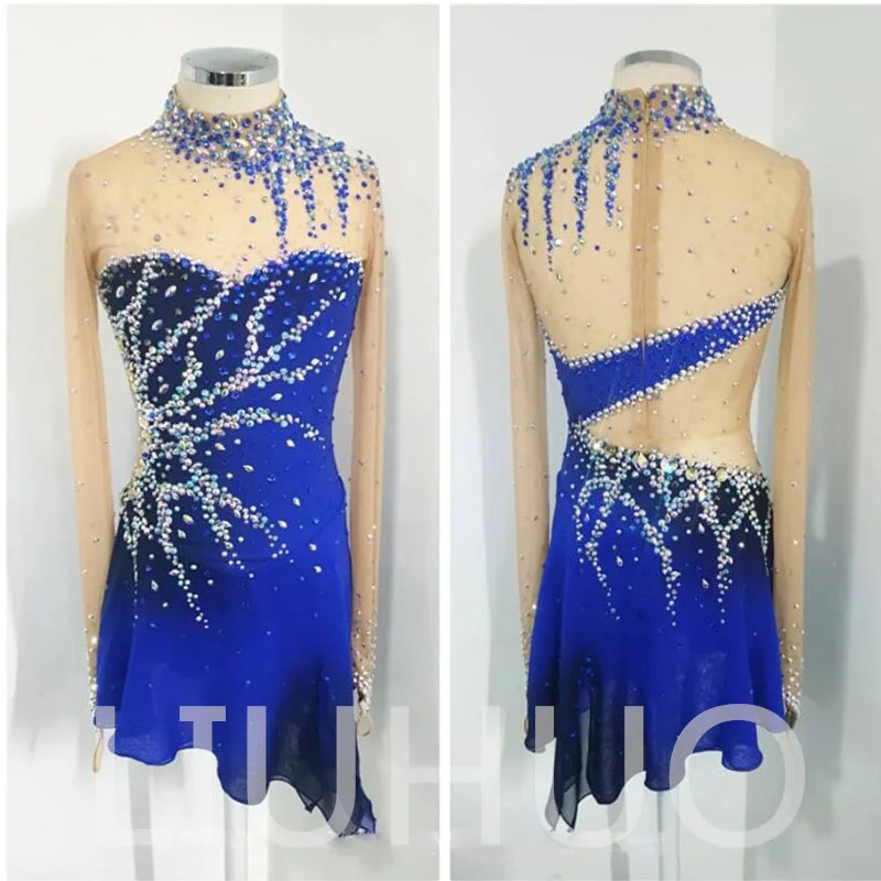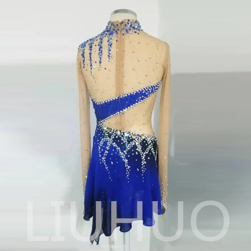 ❤ Features:This is a figure skating dress of the LIUHUO brand. It is mainly blue, with mesh long sleeves and a high - neck design, decorated with a large number of rhinestones. The front shows a gradient and a unique rhinestone pattern, and the back has a hollow - out and a chic rhinestone - decorated shape. It is used for figure skating performances, showing an elegant and gorgeous style.