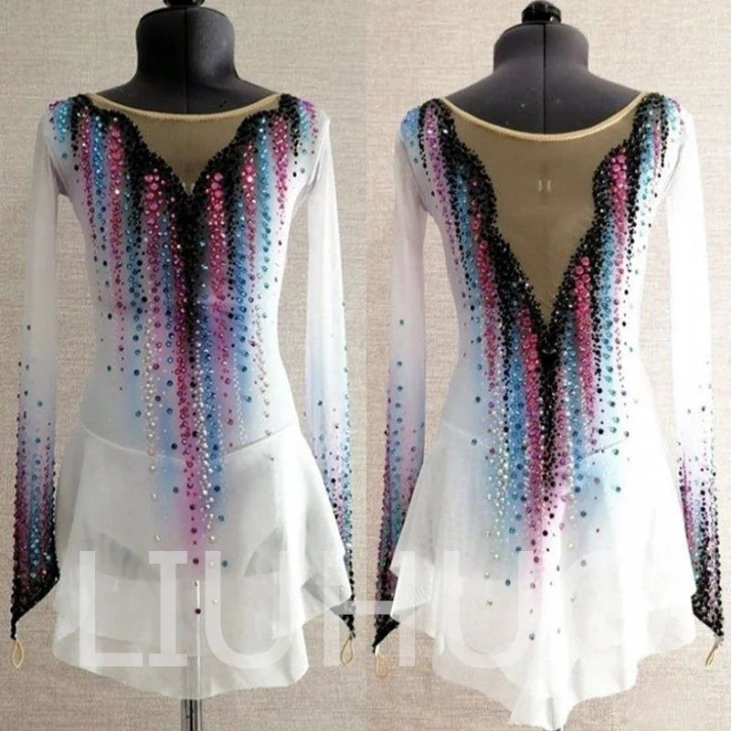 ❤ Features:This is a LIUHUO figure - skating dress. It is mainly white, decorated with colorful gradient rhinestones, has long sheer sleeves, a deep V - neckline in the front and an open - back design, and a layered skirt, suitable for figure - skating performances. It can be a high - end, custom - made outfit with heavy crystal embellishments, often costing around two thousand yuan, and is suitable for children around 120 cm in height to wear for performances.