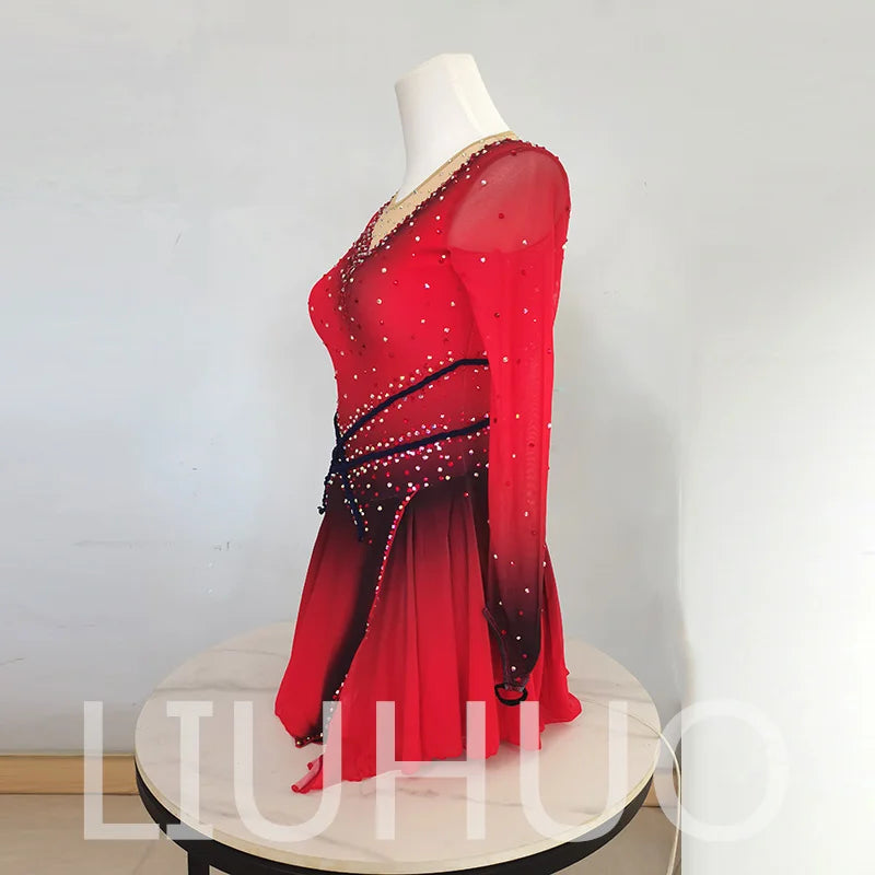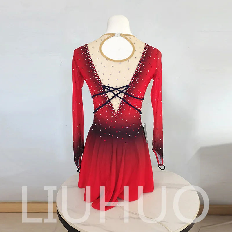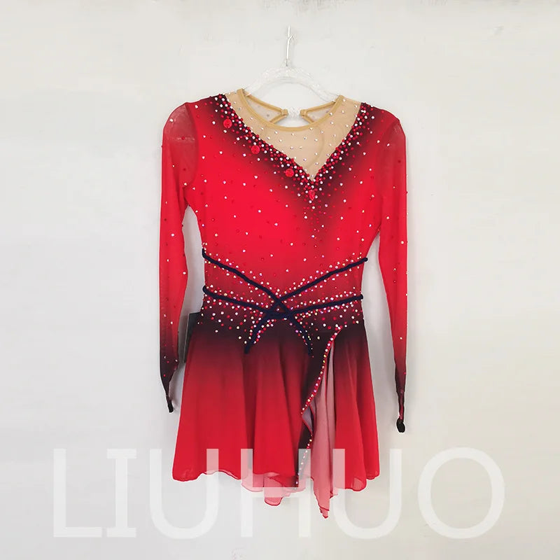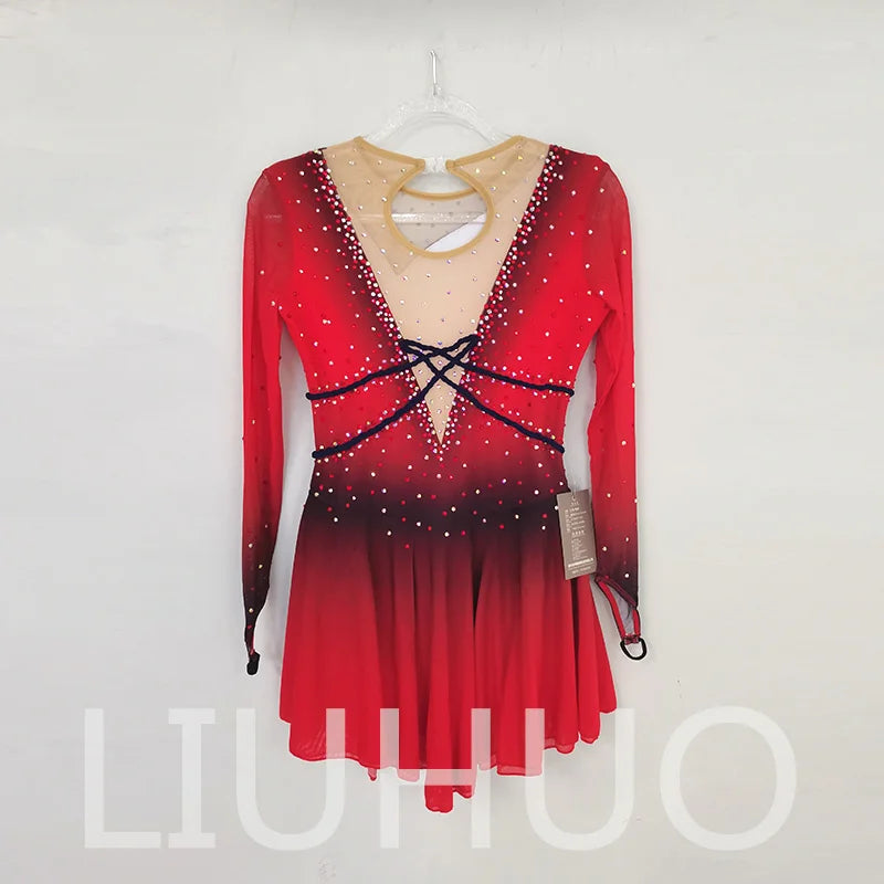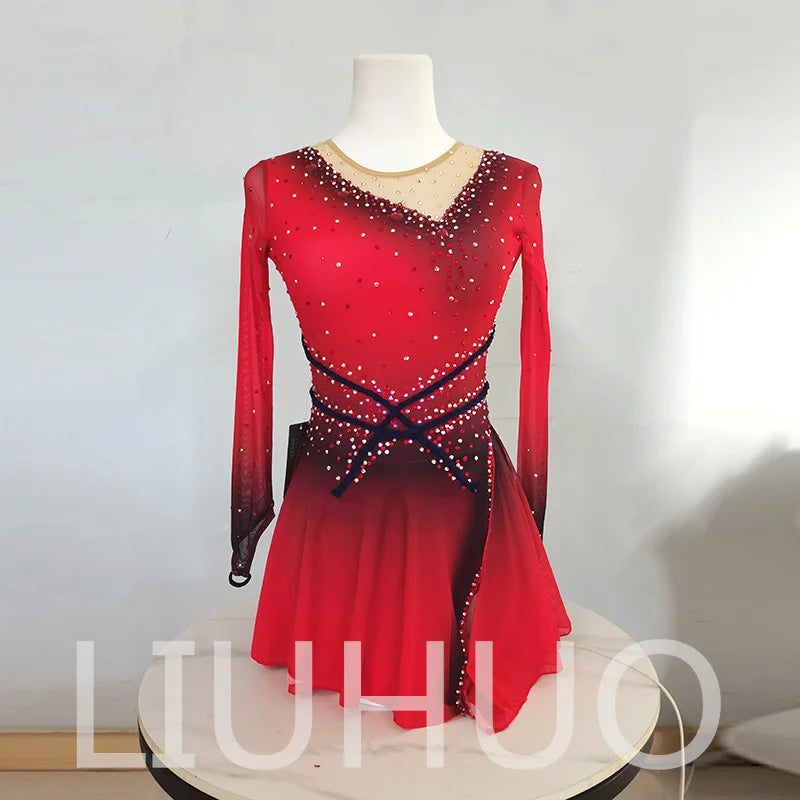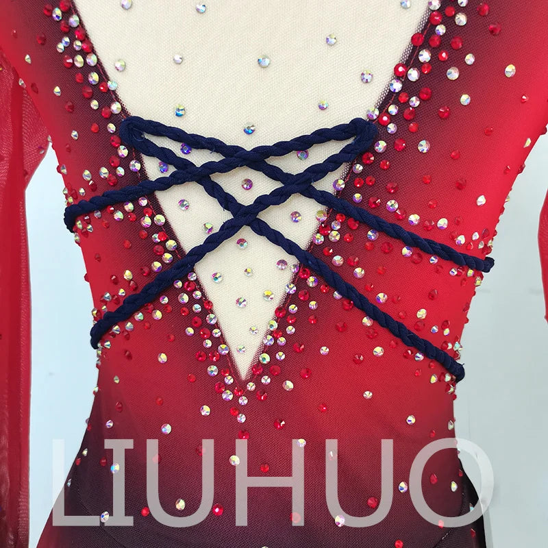 ❤ Features:This is a LIUHUO figure - skating dress. It has a gradient red color, long sheer sleeves, and is decorated with numerous sparkling rhinestones. The blue criss - cross belt at the waist adds a unique design element, and the asymmetric skirt enhances the elegance, perfect for figure - skating performances.
