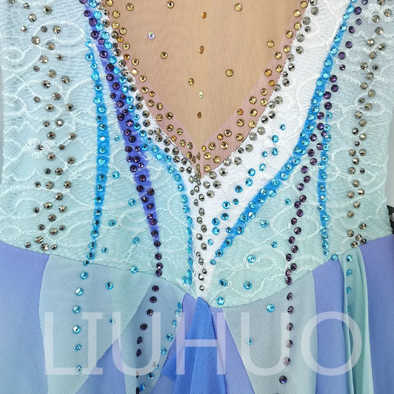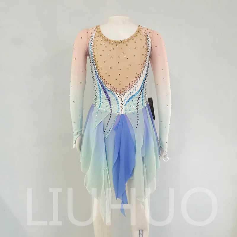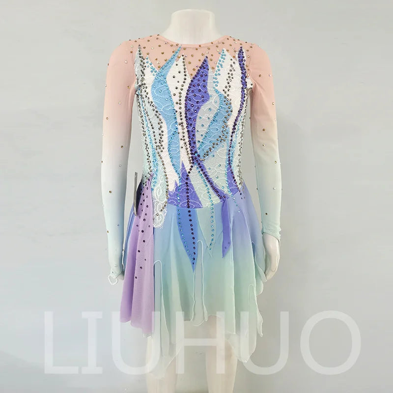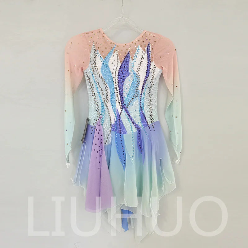 ❤ Features:This is a figure skating dress of the LIUHUO brand. It features a pink - blue - purple gradient color scheme, mesh long sleeves, decorated with rhinestones and unique patterns, and has a gorgeous style, suitable for figure skating performances and other scenarios.