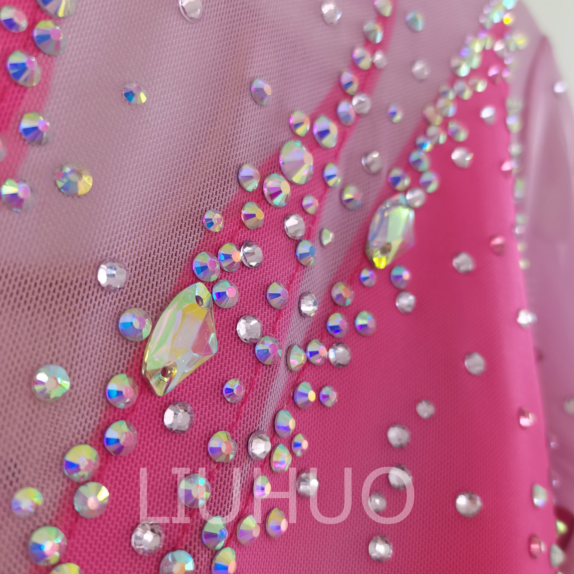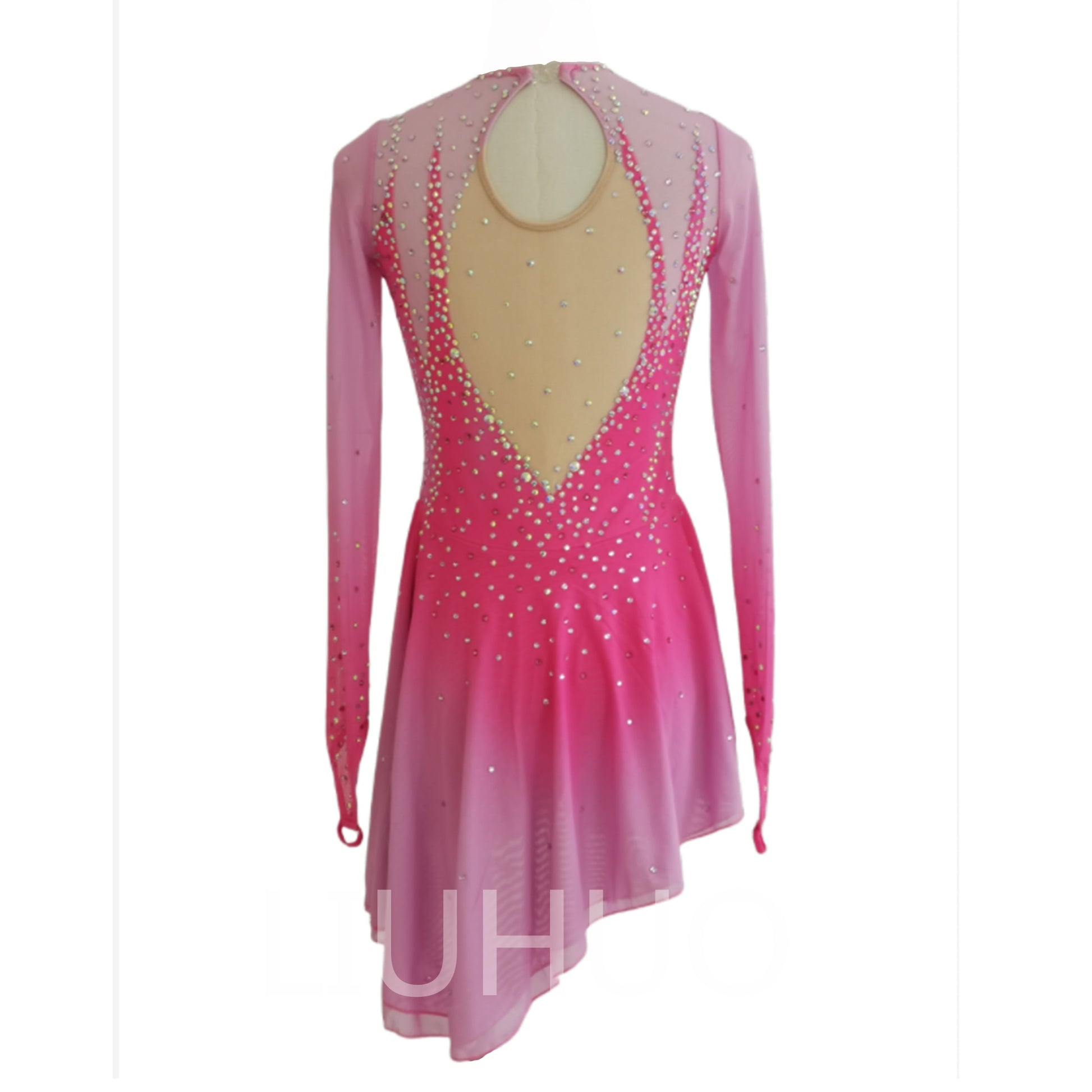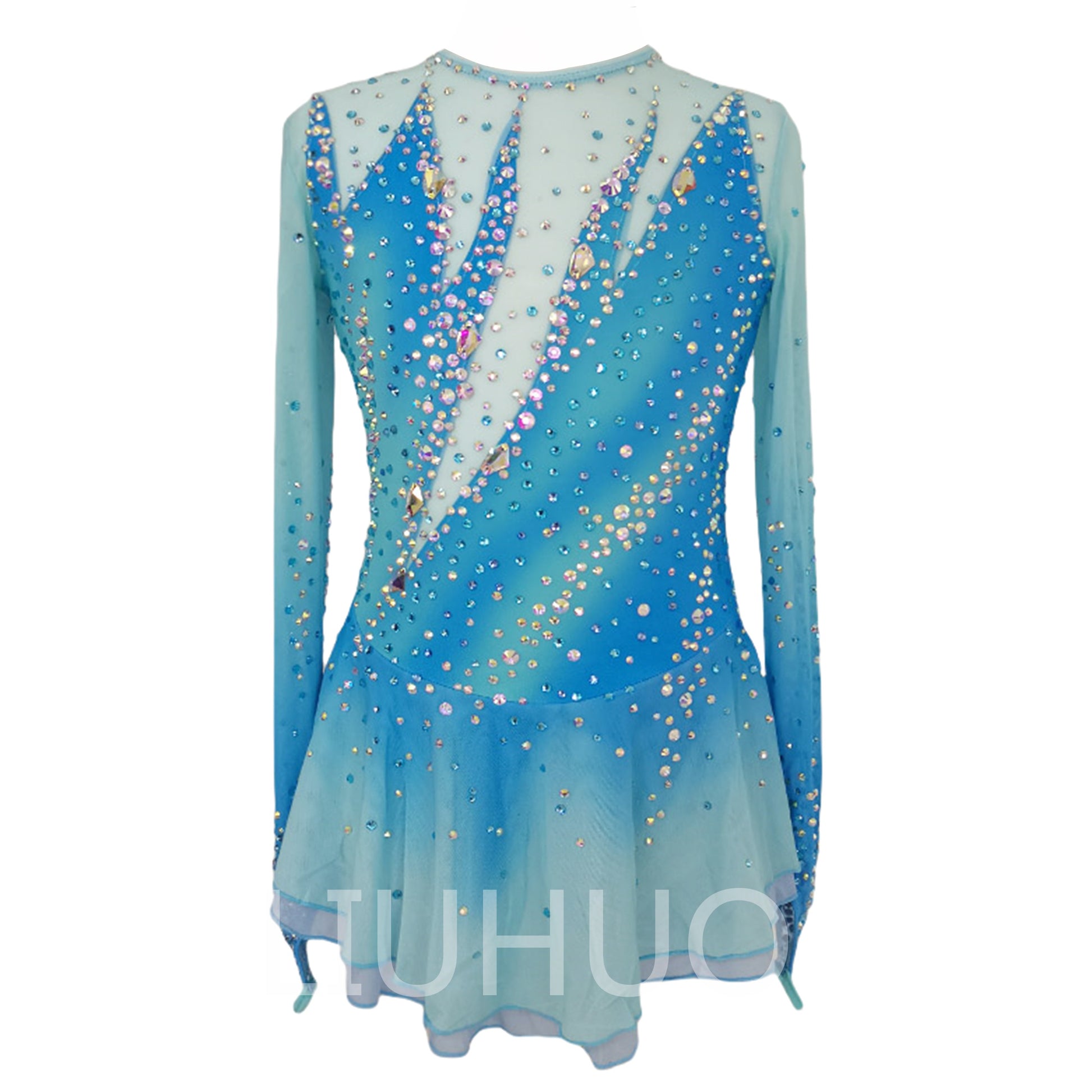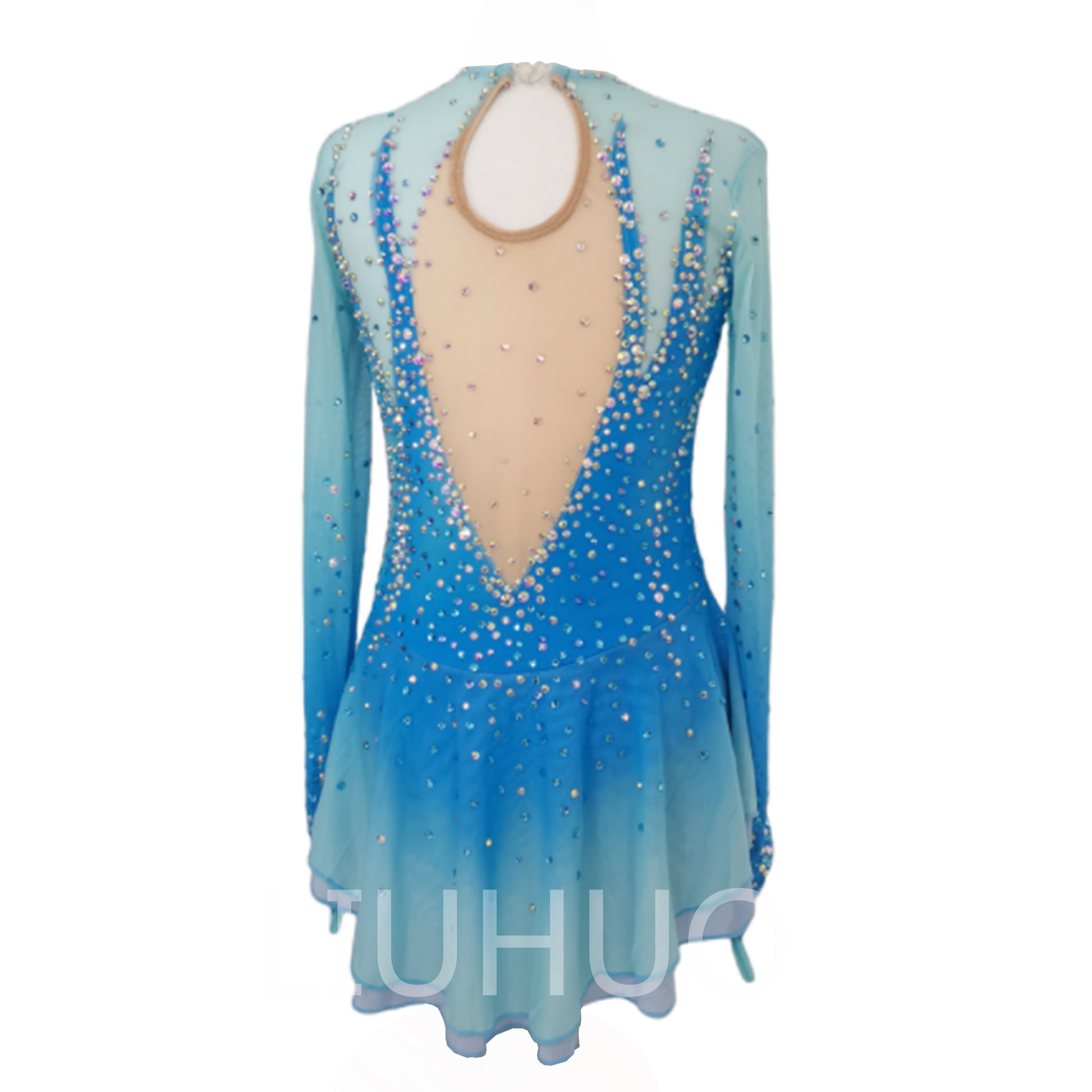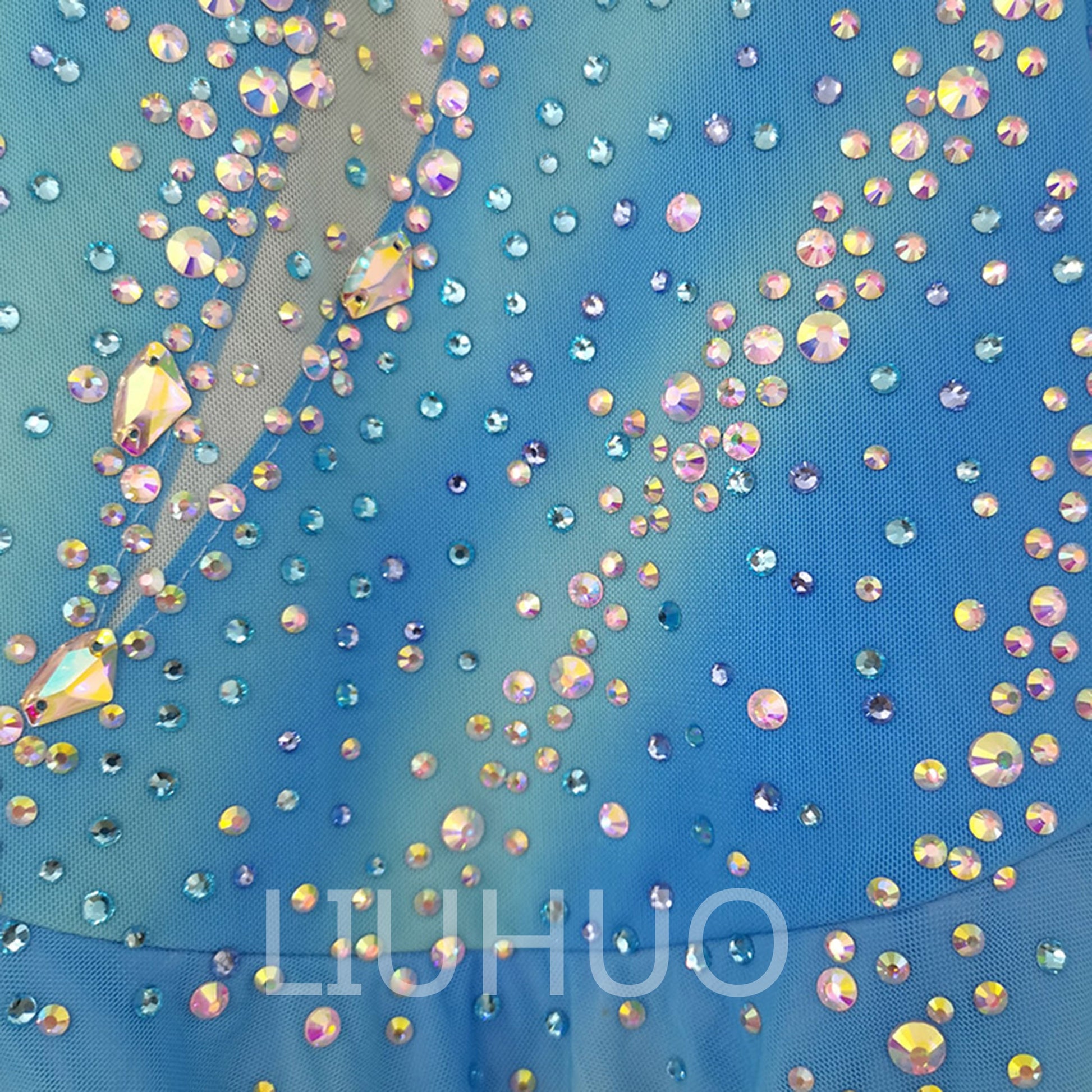 ❤ Features:This is a LIUHUO figure skating dress. It's light blue, with sheer mesh long sleeves. The dress is decorated with numerous sparkling rhinestones and pearls in a beautiful pattern. The back has a unique cut - out design, adding an elegant touch, perfect for figure skating performances.