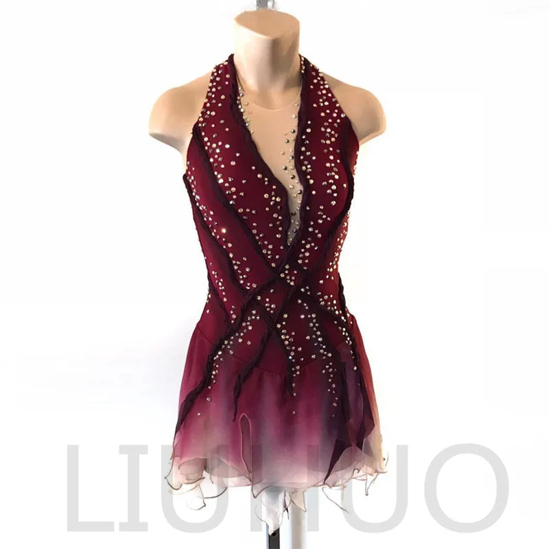 ❤ Features:This is a LIUHUO figure skating dress. It has a halter - neck design, in a gradient color from dark red to light purple. The dress is decorated with numerous sparkling rhinestones in a criss - cross pattern, and features a flared, sheer skirt, suitable for ice skating performances.