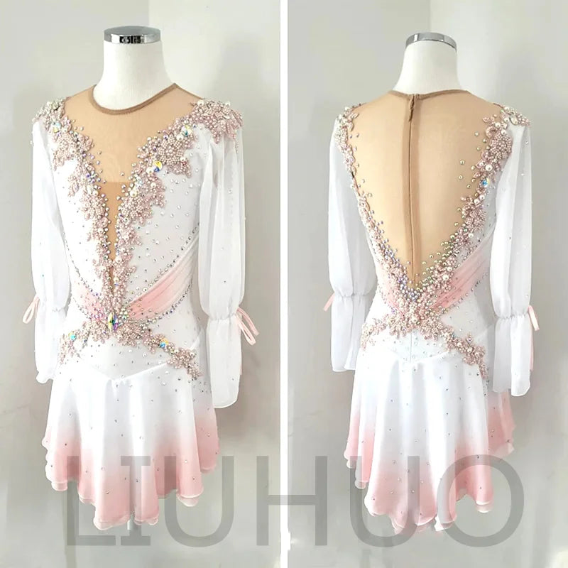 ❤ Features:This is a LIUHUO - brand figure skating dress. It has a white - to - pink gradient main body, mesh long sleeves, decorated with pink bead flowers and rhinestones, and a hollow back. The design is exquisite and gorgeous, suitable for figure skating performances and other scenarios.
