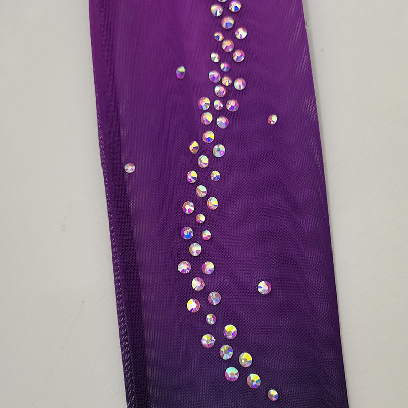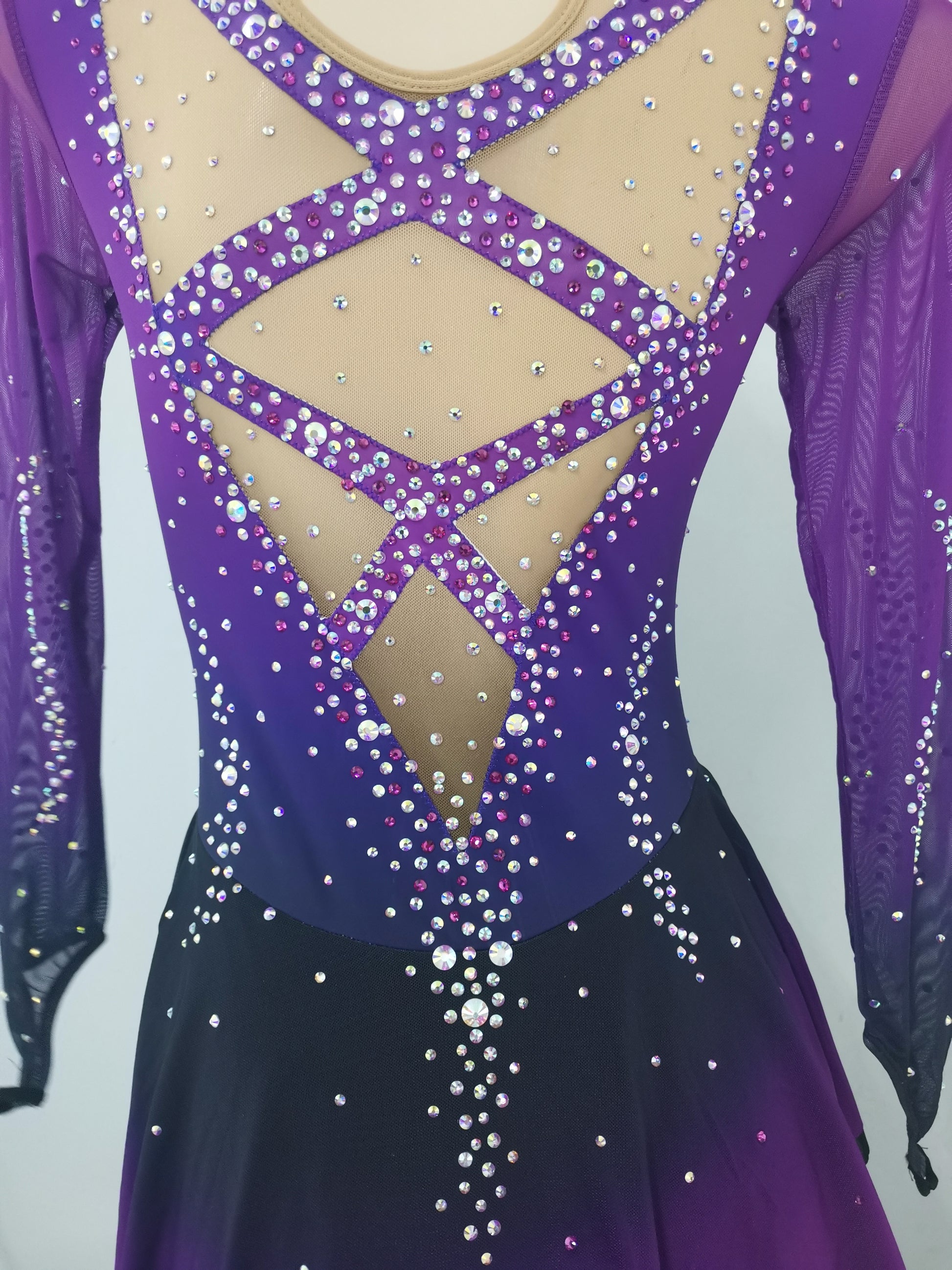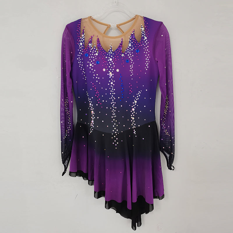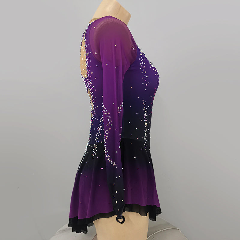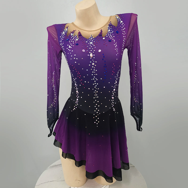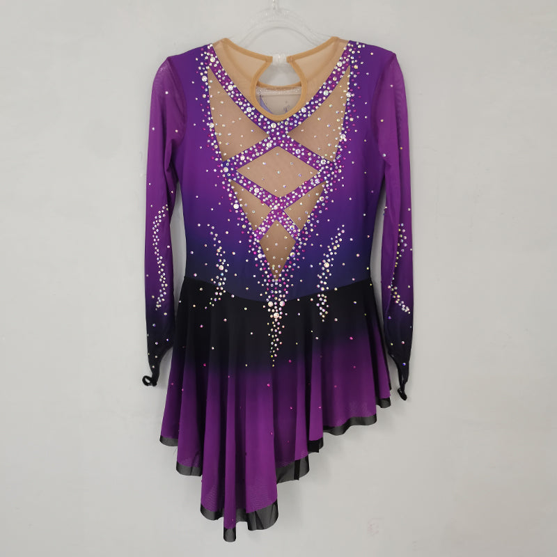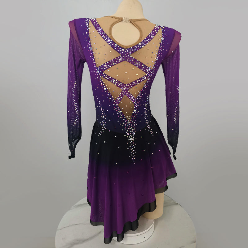 ❤ Features:This LIUHUO figure - skating dress is a vision of elegance and sparkle. Its gradient of purples, shifting from deep to light, gives it a captivating allure. The long, sheer sleeves add a graceful touch. The bodice and skirt are densely studded with rhinestones, creating a dazzling effect. The front V - neckline is beautifully adorned, while the back features an intricate X - shaped pattern with a circular detail, all embellished with stones. It's a perfect blend of style and function for skating shows.