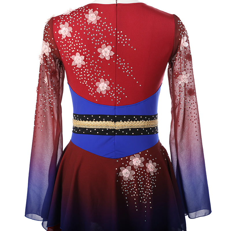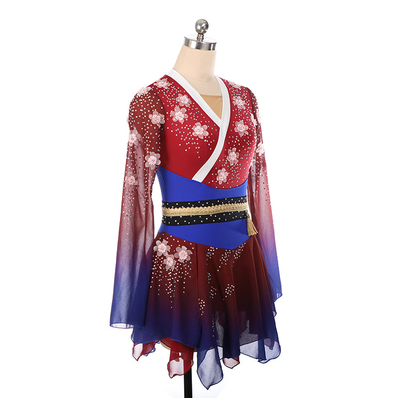 ❤ Features:This LIUHUO figure skating dress blends traditional - inspired design with sporty elegance. It has a gradient color scheme, transitioning from red at the top to blue at the skirt. The bodice features a cross - over V - neckline, floral patterns, and rhinestone embellishments. Sheer gradient sleeves add a graceful touch, while the decorative belt with a tassel cinches the waist, making it a standout choice for female skaters.