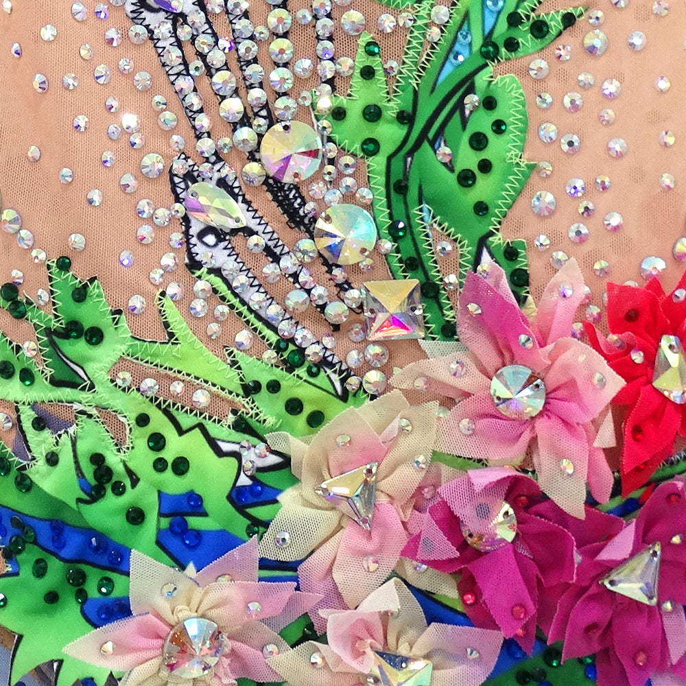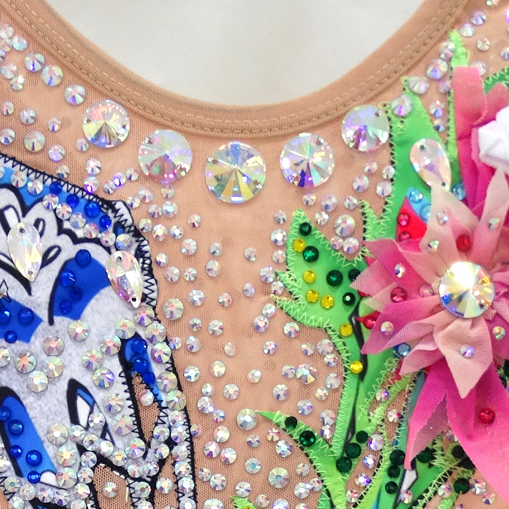 ❤ Features: This is a LIUHUO rhythmic gymnastics leotard. It has a beige base, white ruffled sleeves, and is decorated with colorful floral patterns and numerous sparkling rhinestones, creating a gorgeous and lively look.