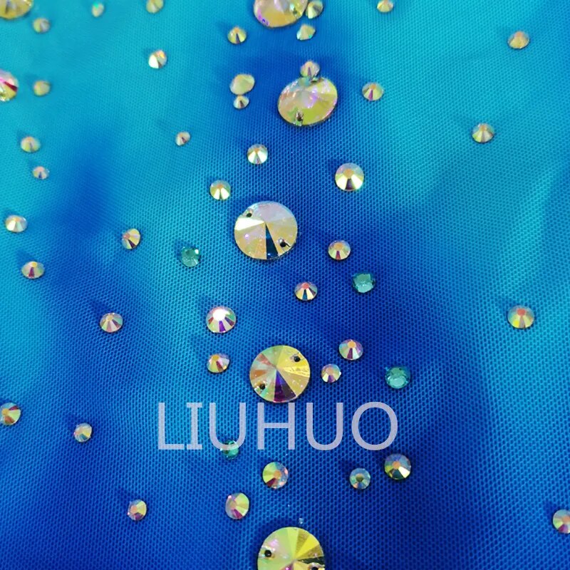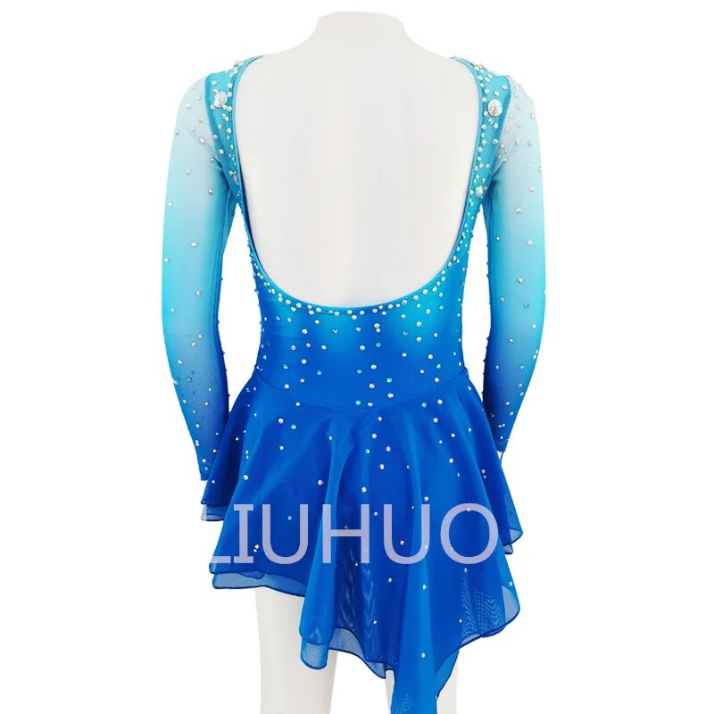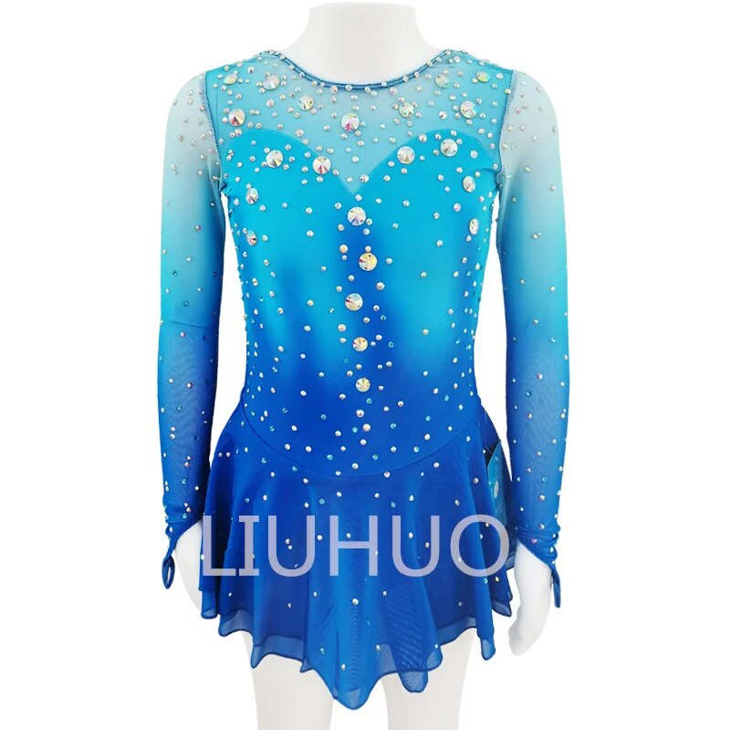❤ Features:This LIUHUO figure - skating dress features a gradient of blue hues, transitioning from a lighter shade at the top to a deeper one towards the bottom. The long - sleeved design incorporates sheer mesh fabric on the upper part, adding an elegant and delicate touch. The entire dress is lavishly adorned with numerous sparkling rhinestones, enhancing its glamorous appeal. The flared skirt contributes to a graceful silhouette, making it a perfect choice for figure - skating performances, combining both style and functionality.