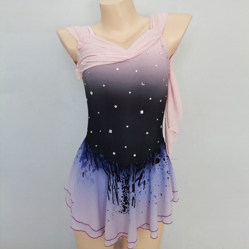 ❤ Features:This LIUHUO figure skating dress is a charming blend of elegance and style. It features a gradient color scheme transitioning from black at the top to soft purples and pinks towards the skirt. The sleeveless design showcases delicate, gathered fabric on one shoulder, adding a touch of grace. The bodice is adorned with small, sparkling rhinestones that catch the light, enhancing its allure. The skirt, with its ruffled hem and artistic black splatter design, allows for fluid movement, making it perfect for skaters to perform with both beauty and freedom on the ice.