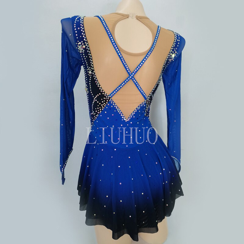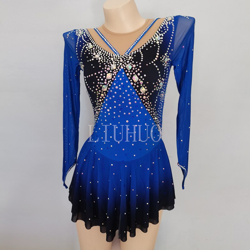 ❤ Features:This LIUHUO figure skating dress is a remarkable creation. It features a striking combination of deep blue and black with a gradient effect on the skirt. The long - sleeved design incorporates sheer panels on the shoulders, adding an elegant touch. The bodice is adorned with an abundance of sparkling rhinestones in various shapes and sizes, arranged in an intricate pattern that catches the light beautifully. The V - neckline and the criss - cross straps at the front enhance its stylish look. This dress not only offers skaters freedom of movement but also makes them shine brightly on the ice with its glamorous details.