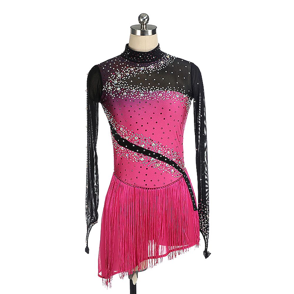 ❤ Features:This LIUHUO figure skating dress has a gradient color from black to pink. It features a high - neck design, with sheer black sleeves decorated with rhinestones. The pink bodice is dotted with sparkling stones and has a black, rhinestone - lined strap across it. The skirt is made of pink fringes, adding a dynamic and elegant touch for skaters.