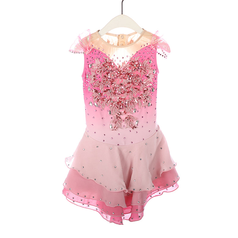 ❤ Features:This LIUHUO figure skating dress showcases a gradient pink hue, transitioning from a deeper shade on top to a softer tone at the skirt. It features sheer, delicate shoulder accents and is lavishly adorned with sparkling rhinestones in an intricate floral pattern on the bodice. The layered skirt, dotted with more rhinestones, adds a graceful, twirl-ready flair—perfect for young skaters and women to shine on the ice.