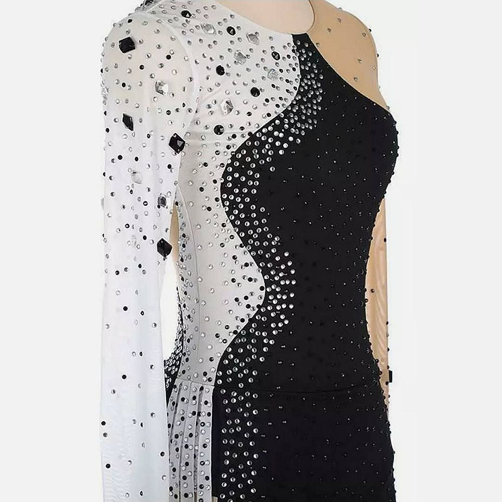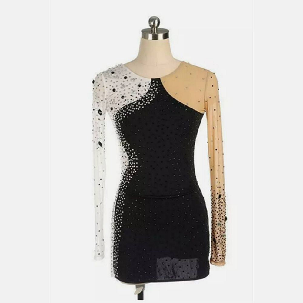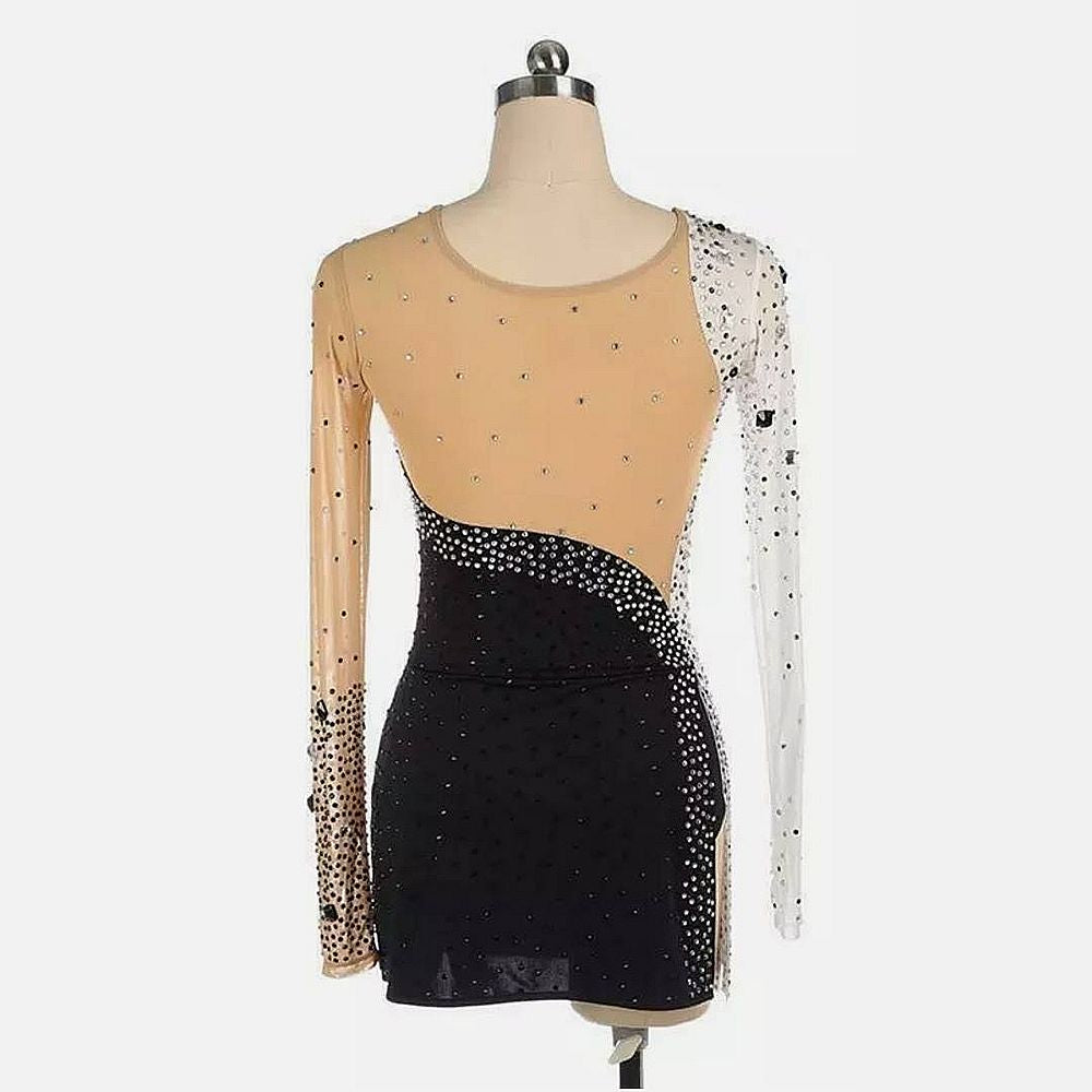❤ Features:This LIUHUO figure skating dress has a unique design. The upper part combines black fabric with sheer white and beige mesh sections, all embellished with numerous sparkling rhinestones. It features long sleeves and a short, form - fitting skirt, suitable for elegant figure skating performances.